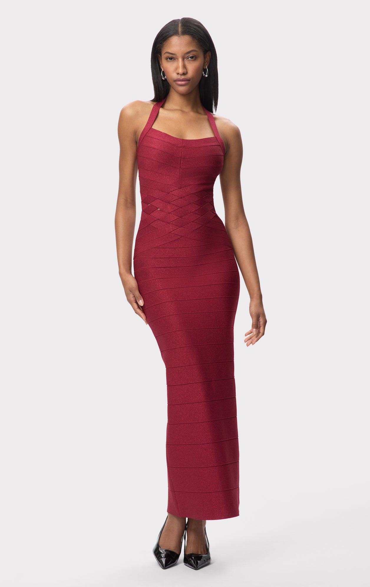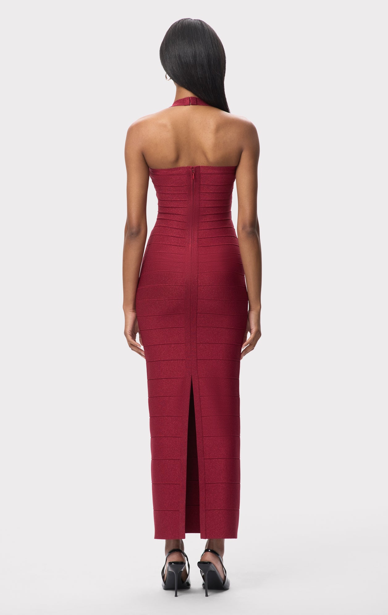 A gradient bandage silhouette from Look 2 of the Resort '26 Lookbook. The Maxine Gown is cut from metallic bandage with a true bandage bodice, halter neckline and weave detail at the waist. The ankle-length gown is finished with a back slit and center-back zip.