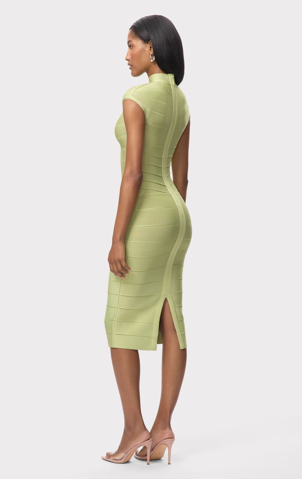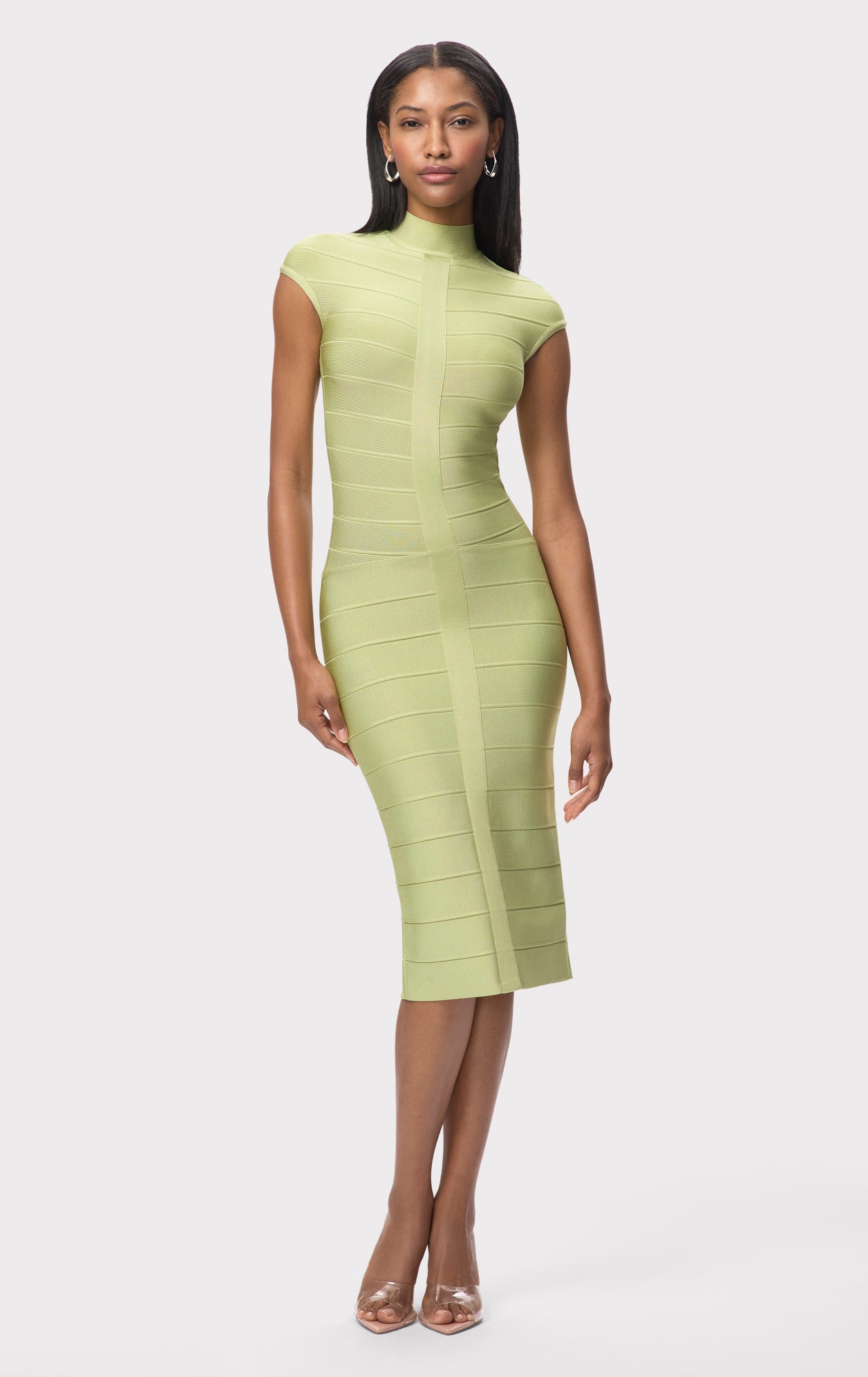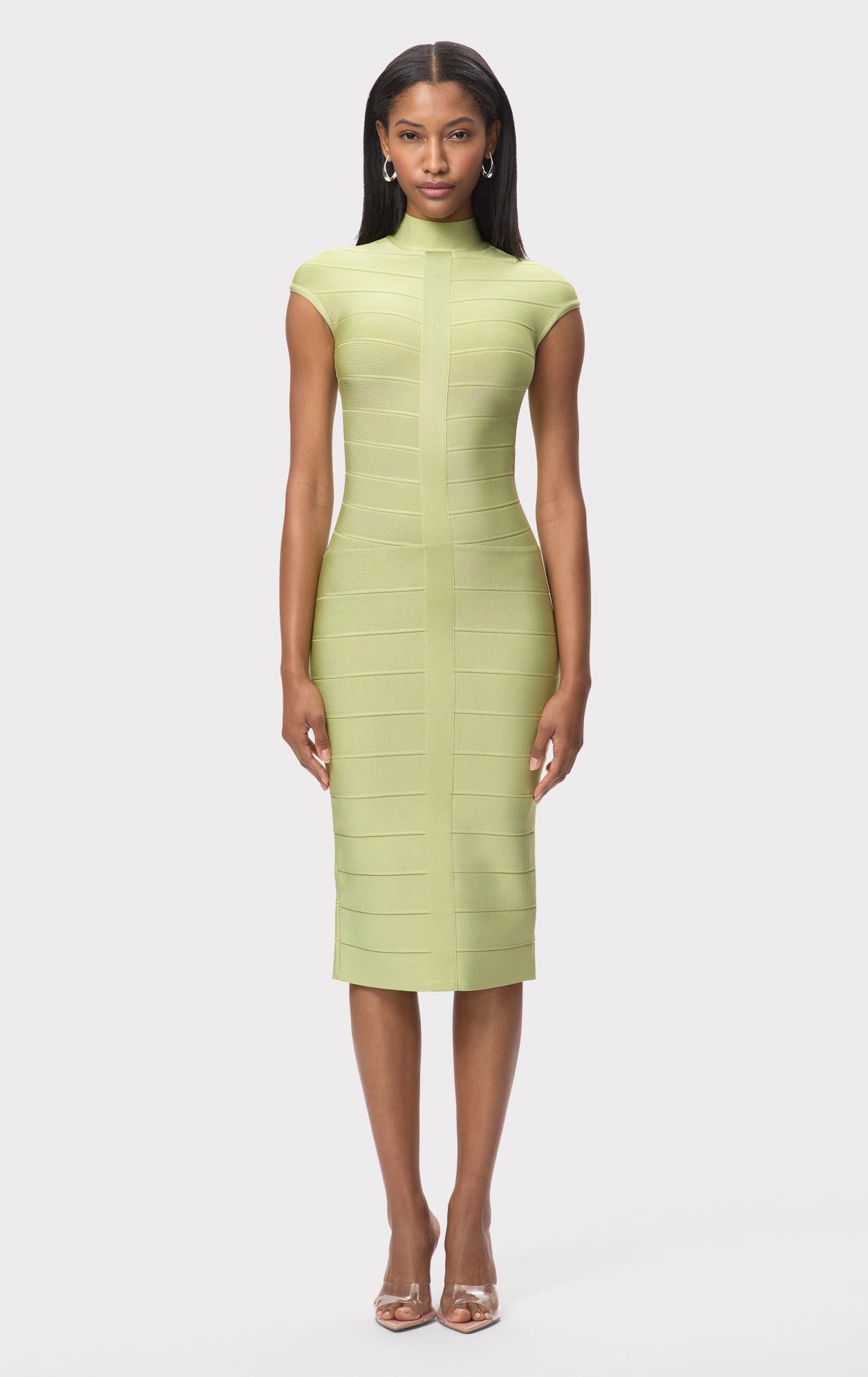 As seen in Look 8 of the Resort '26 Lookbook, the Davina Dress is a midi cut from bandage knit designed to smooth and sculpt. Features a high neckline, cap sleeves and chevron true bandage detailing on the bodice. Finished with true bandage accents, back slit and a center-back zip. Made with eco-friendly recycled yarns.