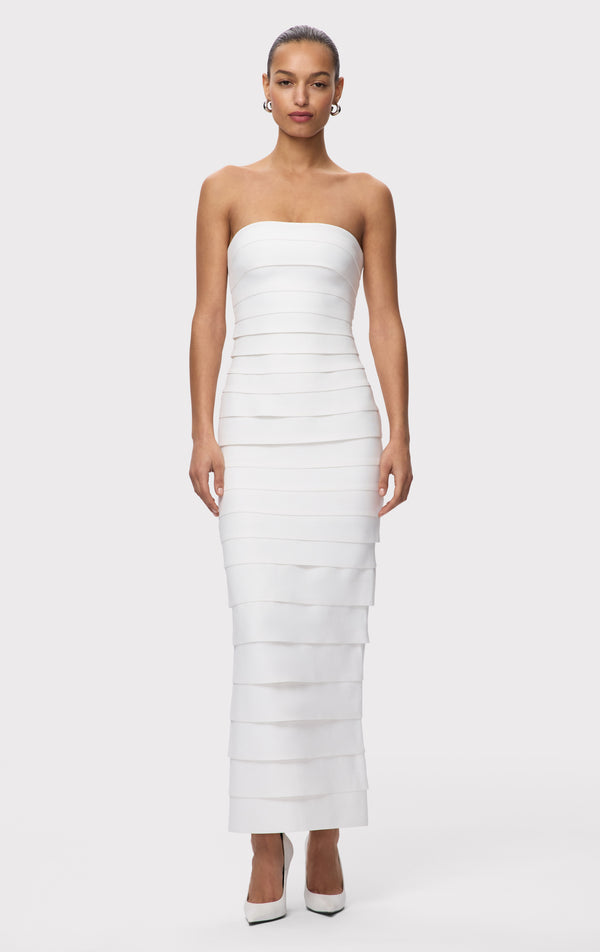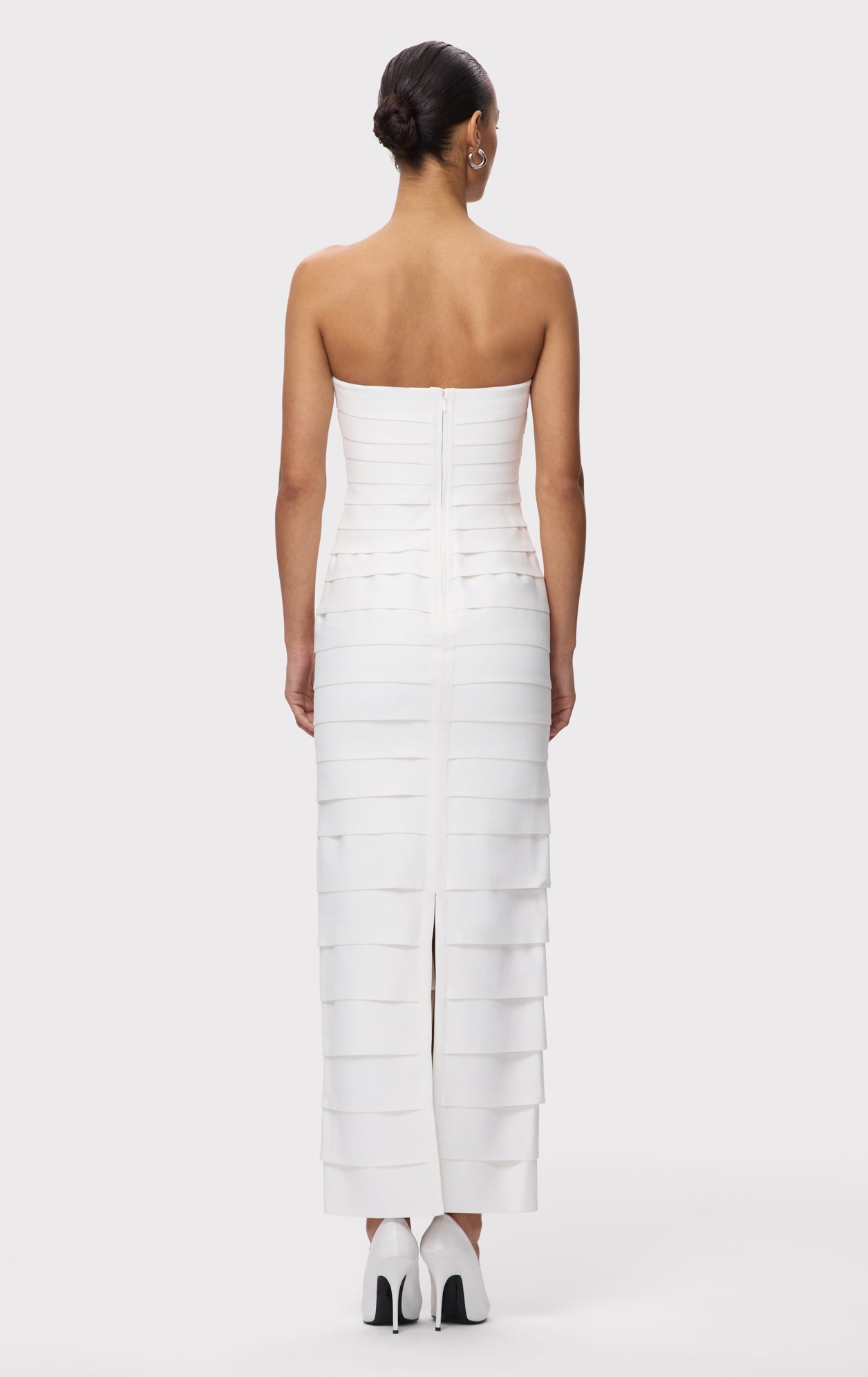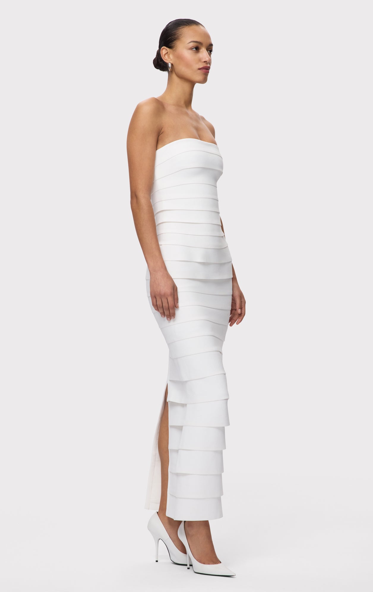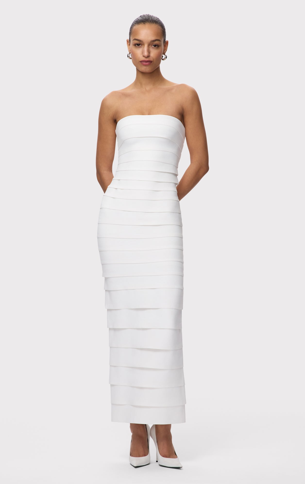 As seen in Look 5 of the Spring '26 Lookbook, the Elaina Gown is a strapless, ankle-length gown featuring tiered true bandage. The nude mesh underlayer gives a sheer illusion effect with the 3-D bandage detail. Finished with a center-back slit and zip.