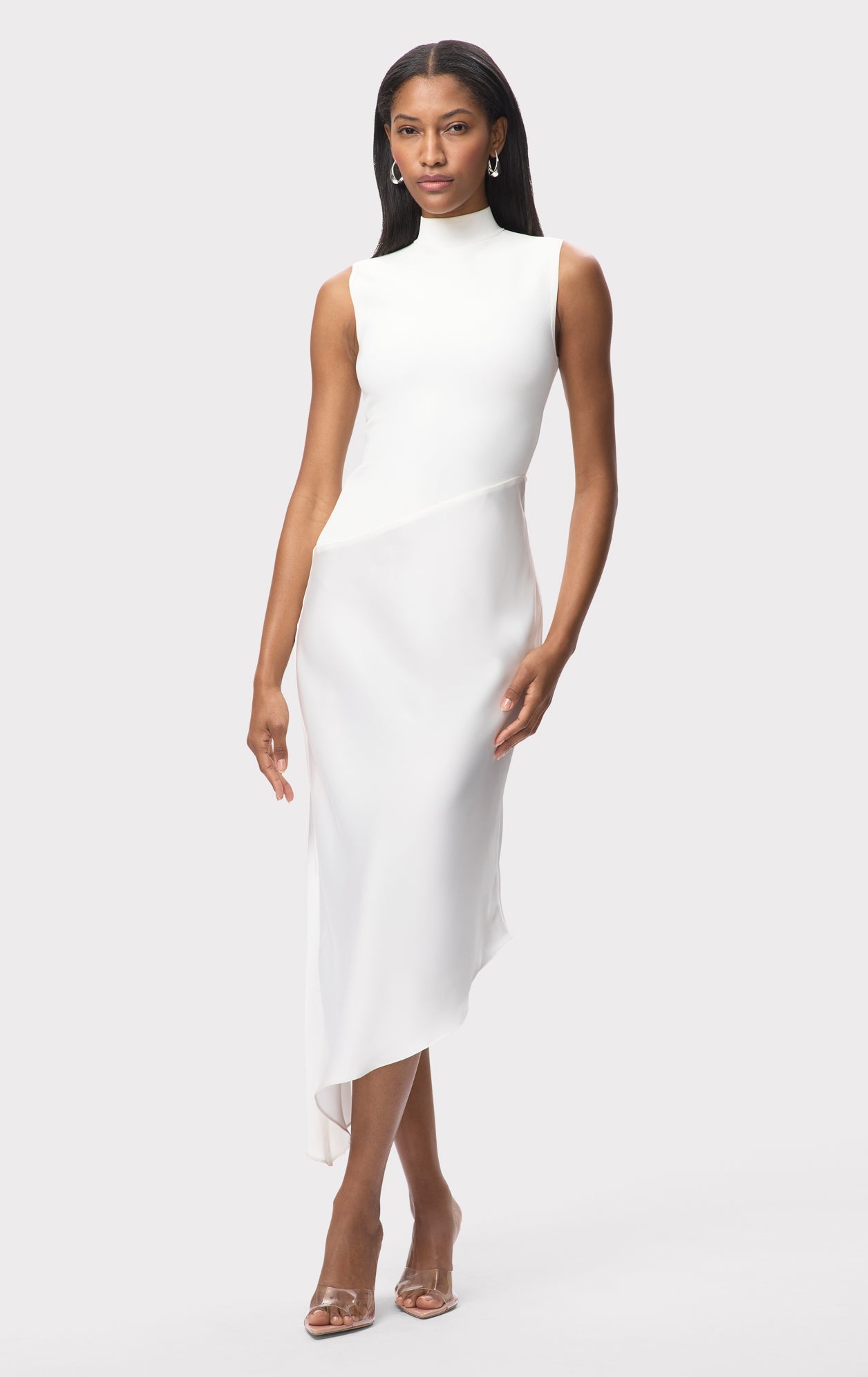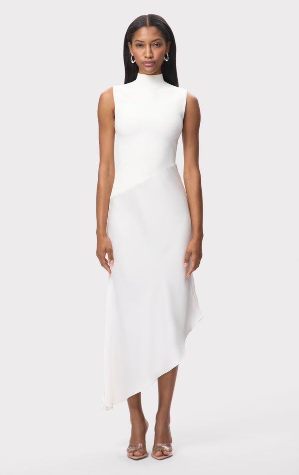 As seen in Look 16 of the Resort '26 Lookbook, the Esme Dress is a chic silhouette cut from a compact knit with a liquid satin skirt. Features a mock neckline and an asymmetrical hem. The sleeveless dress is finished with a center-back zip.
