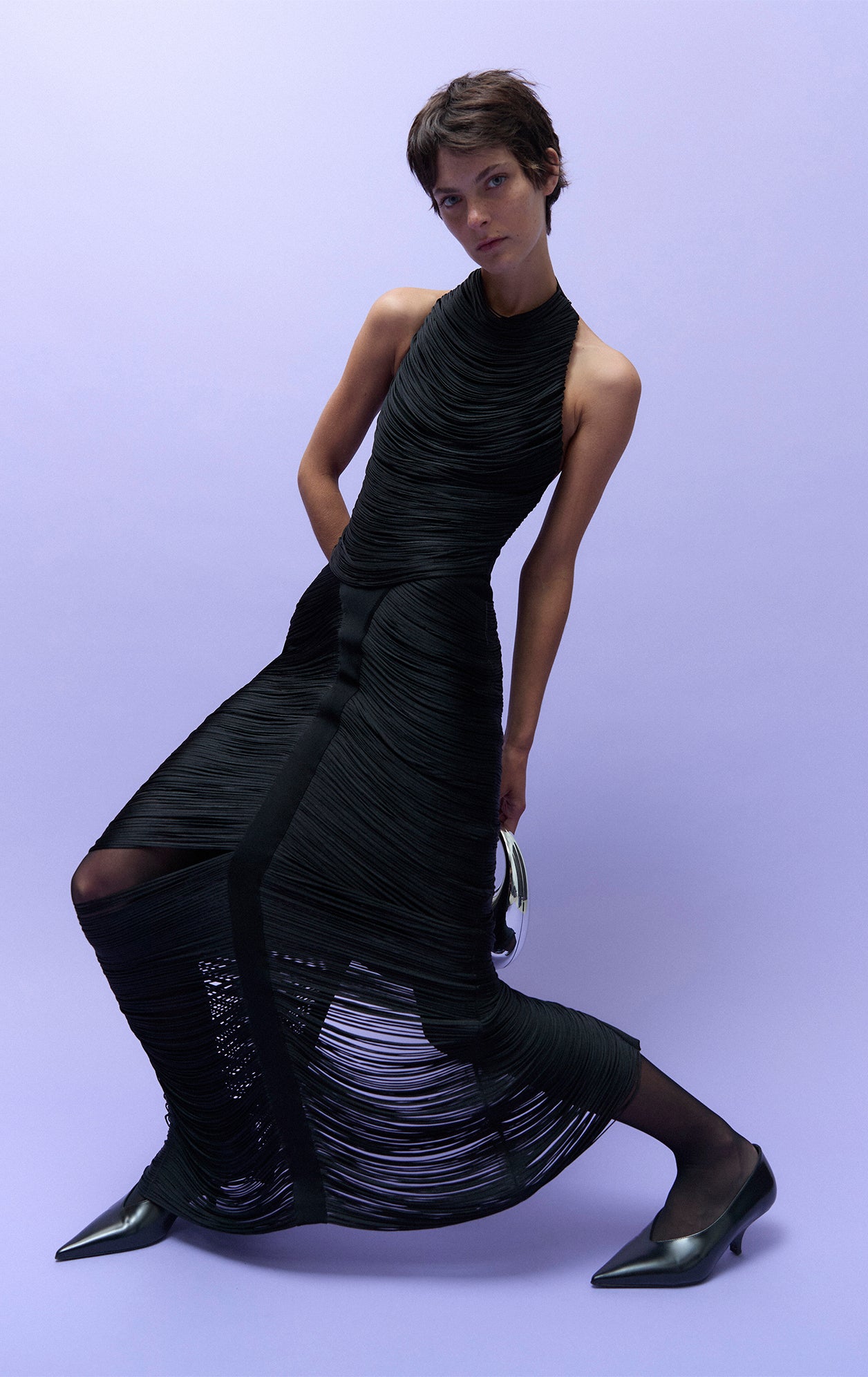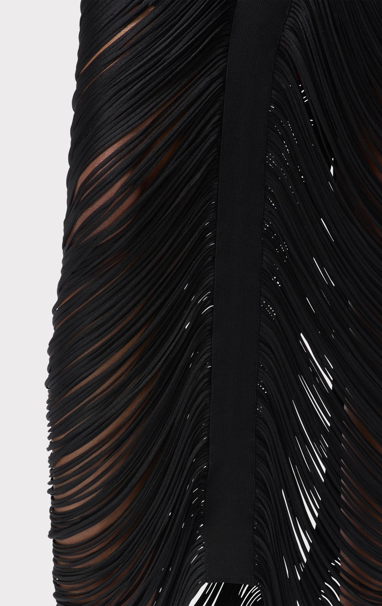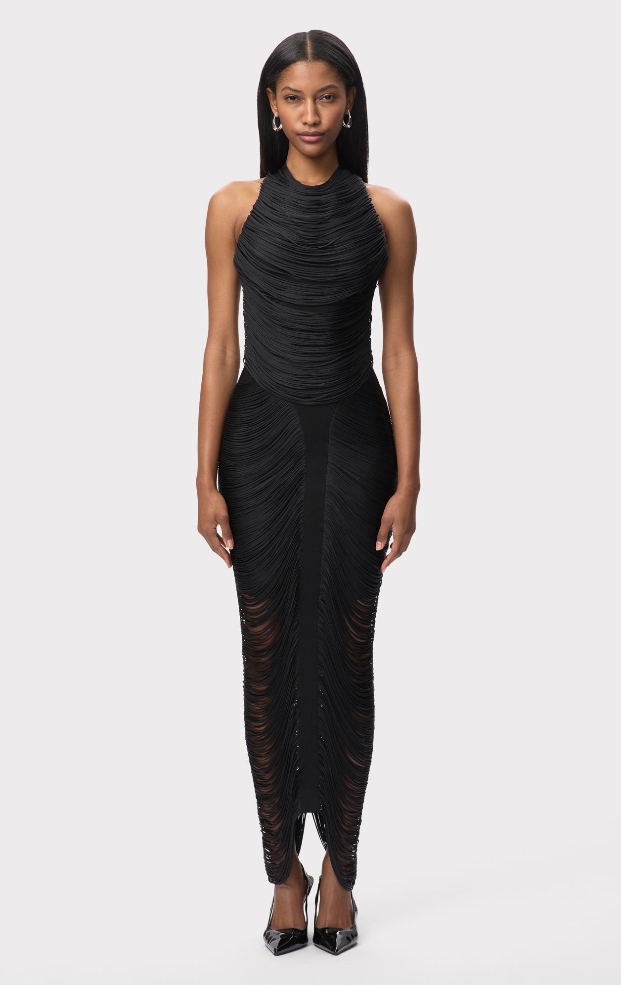 The Faye Gown, as seen in Look 14 of our Resort '26 Lookbook, features a high halter neckline with all-over fringe details. The compact knit mini underlayer is finished with ankle-length draped fringe, a back slit and a center-back zip.