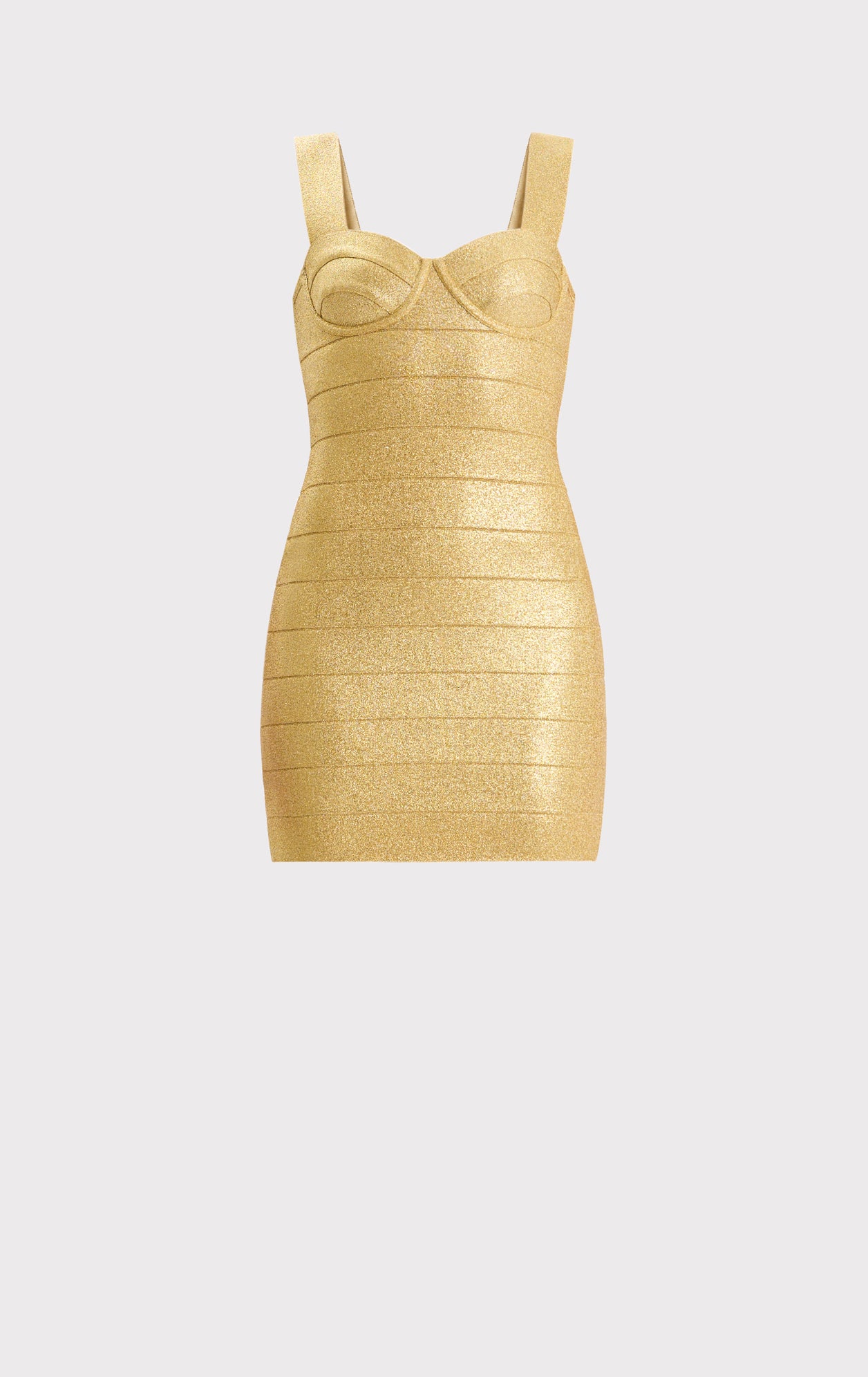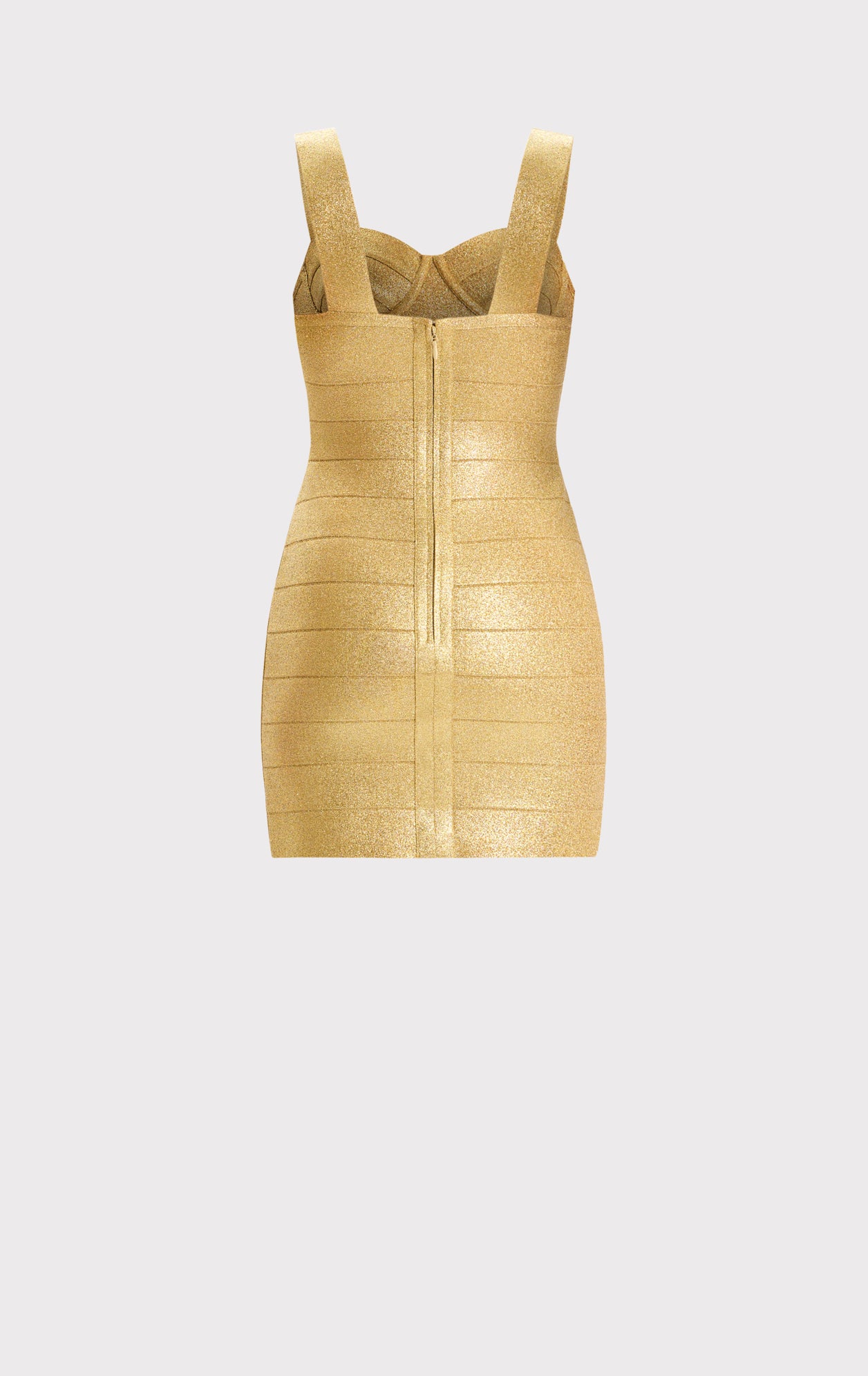 Cut to hug the body, a metallic double knit dress featuring bandage styling with a lifting bustier. The mini is finished with a smooth inner lining and concealed center-back zip.