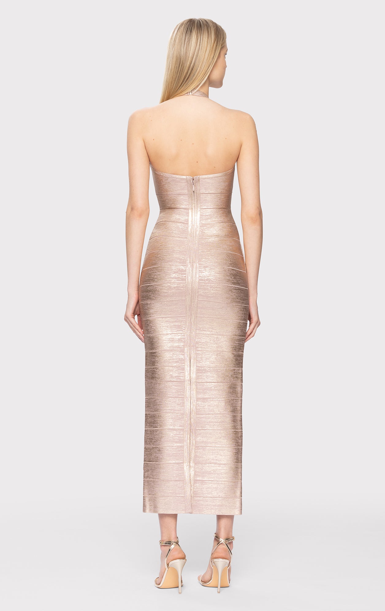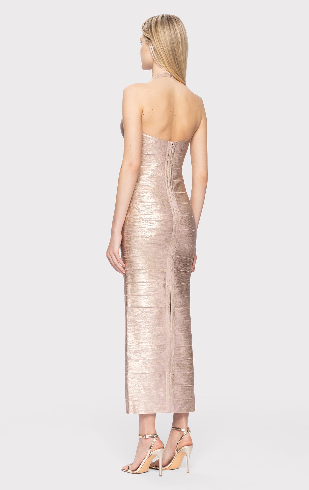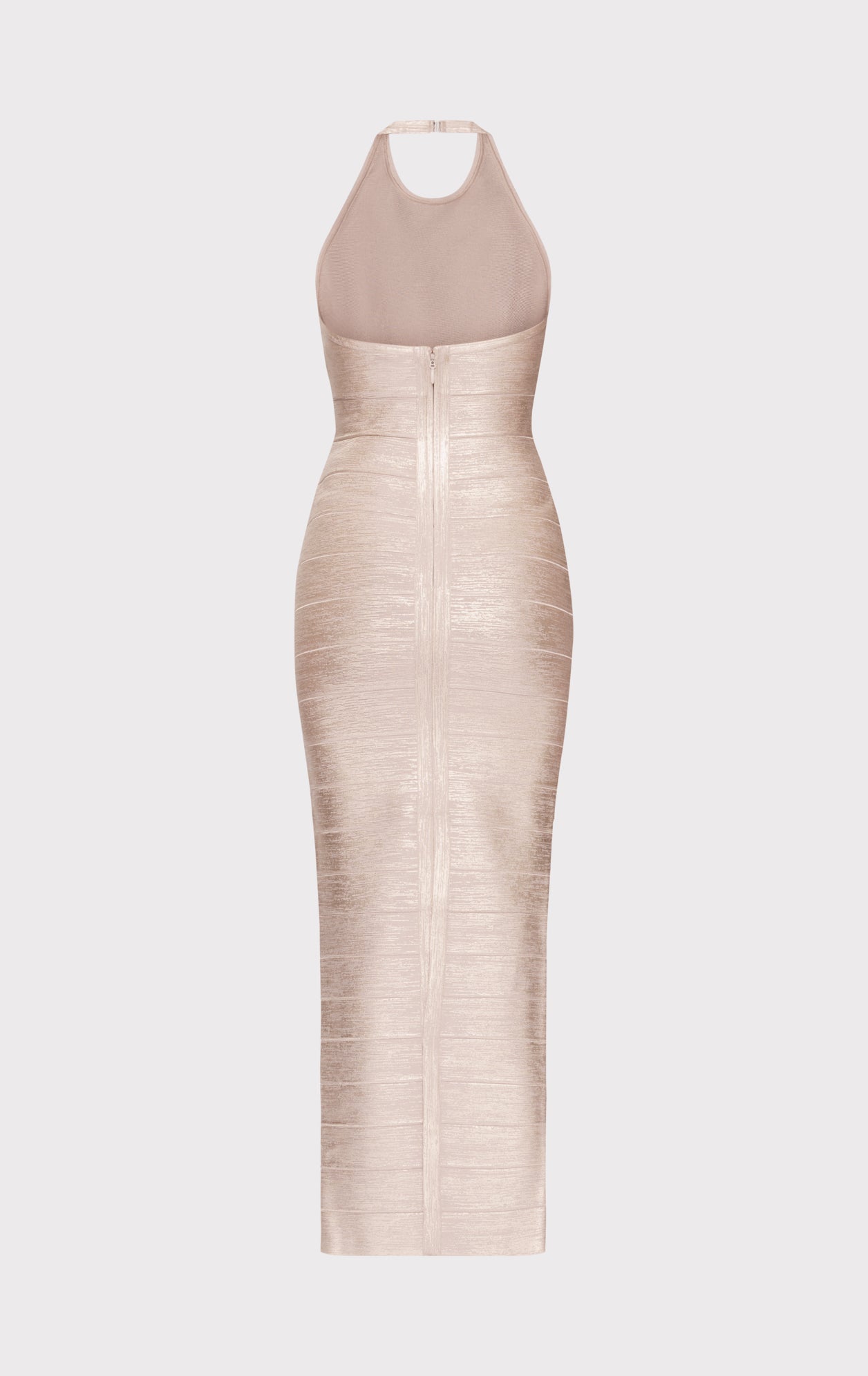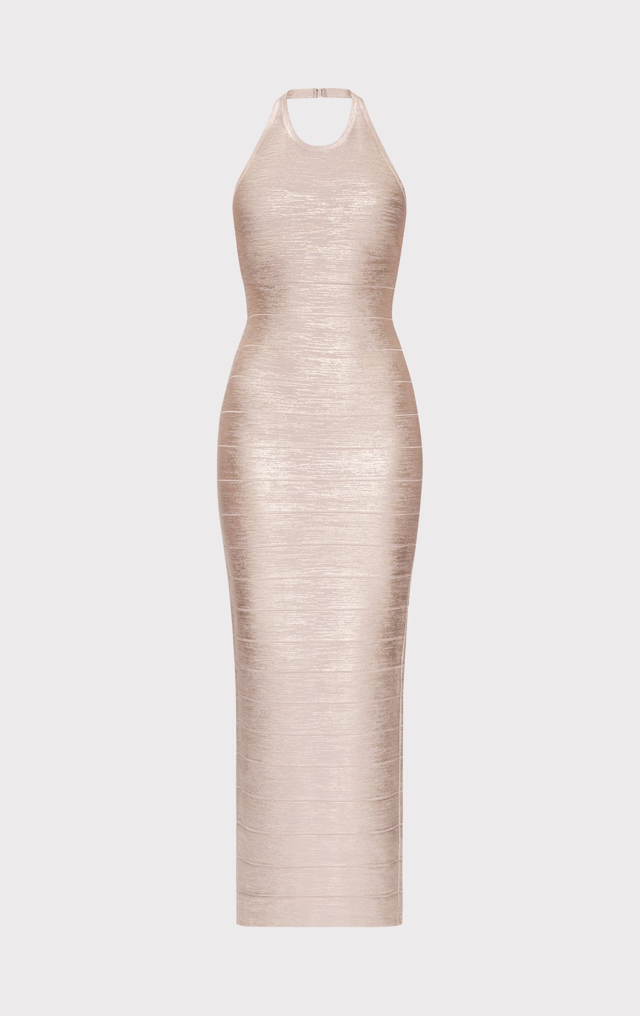 This classic bodycon foiled bandage gown features a column gown silhouette that's fitted throughout, with a halter at the neck.