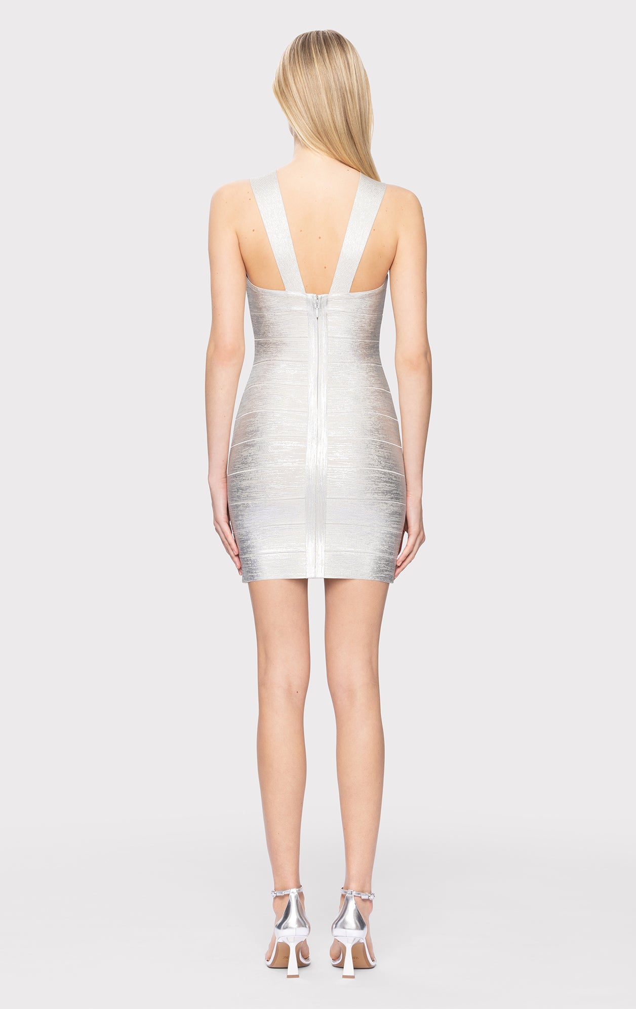 A mini dress made with our signature foiled bandage and a crossover halter neckline.