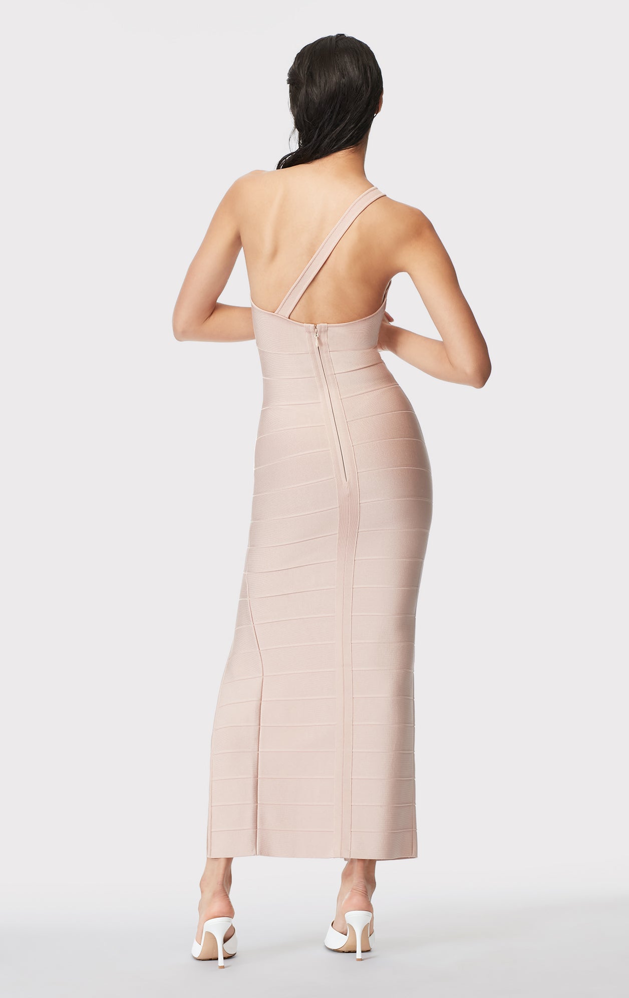 Cut from our classic bandage, this minimalist midi gown provides maximum hold. Features an elegant one-shoulder neckline and a high front slit.