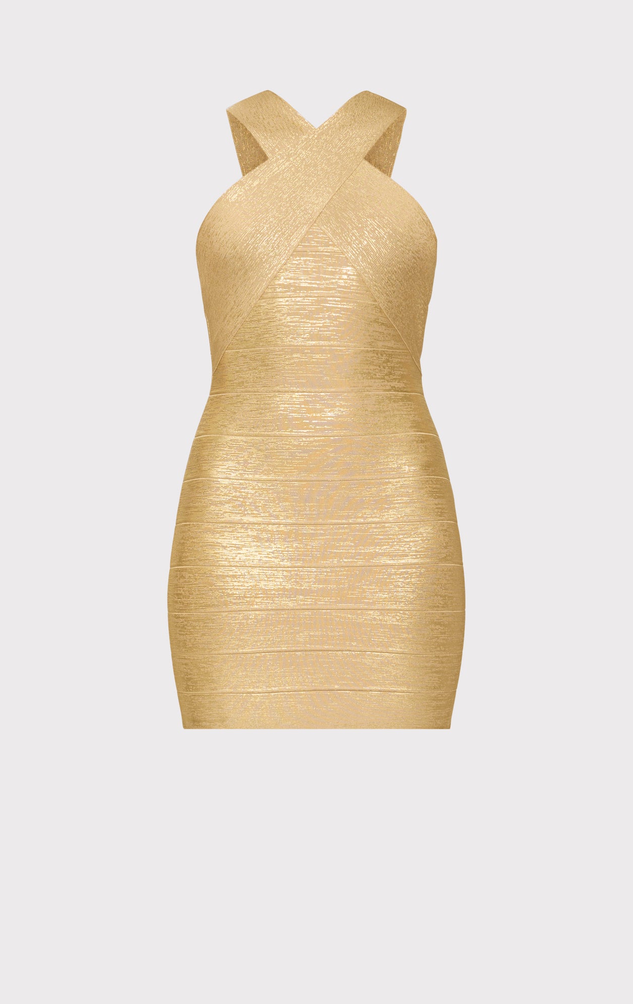 A mini dress made with our signature foiled bandage and a crossover halter neckline.