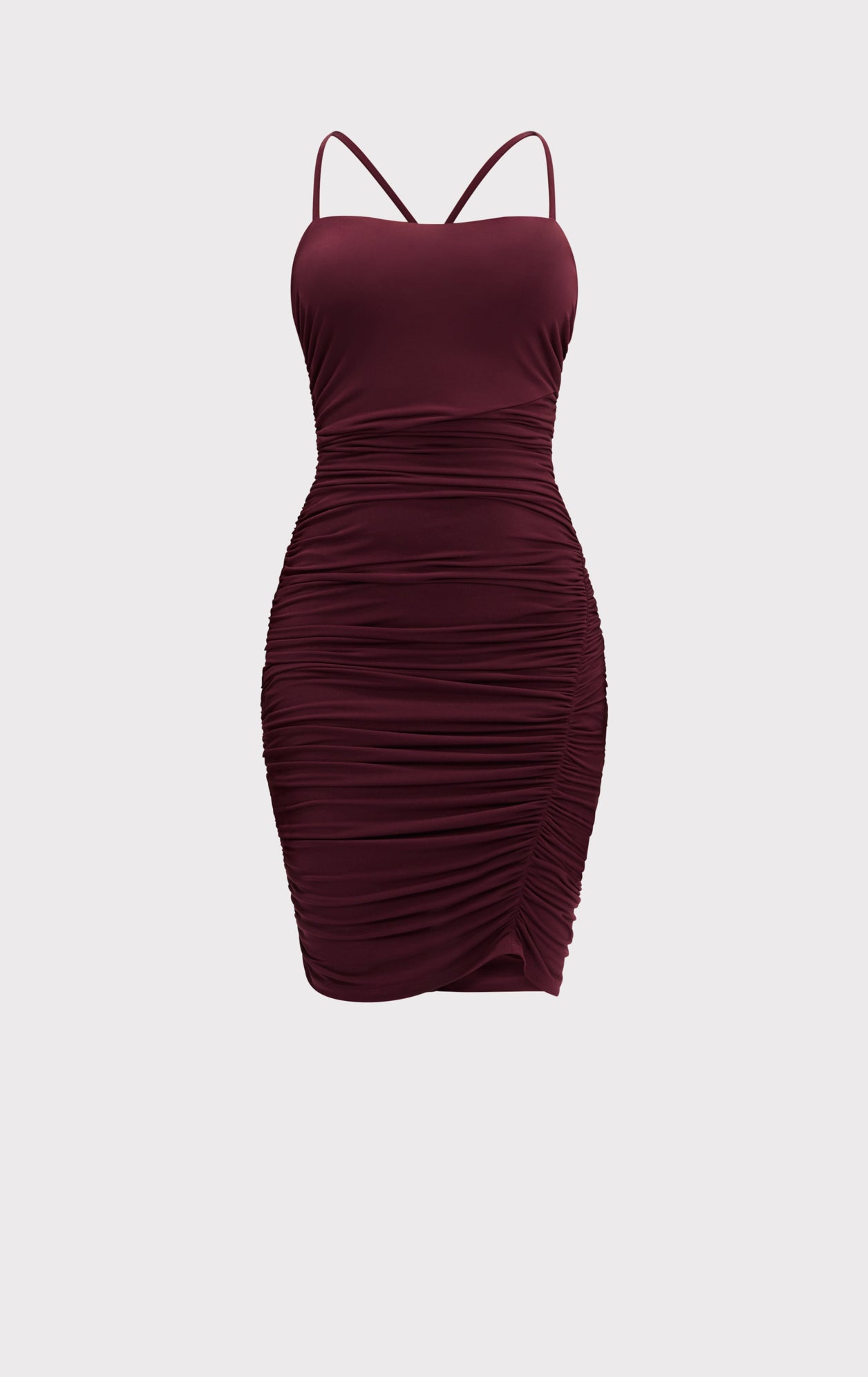 This body-skimming dress is cut from a lightweight jersey that contours curves. The mini is finished with a cami-cut neckline and light ruching.