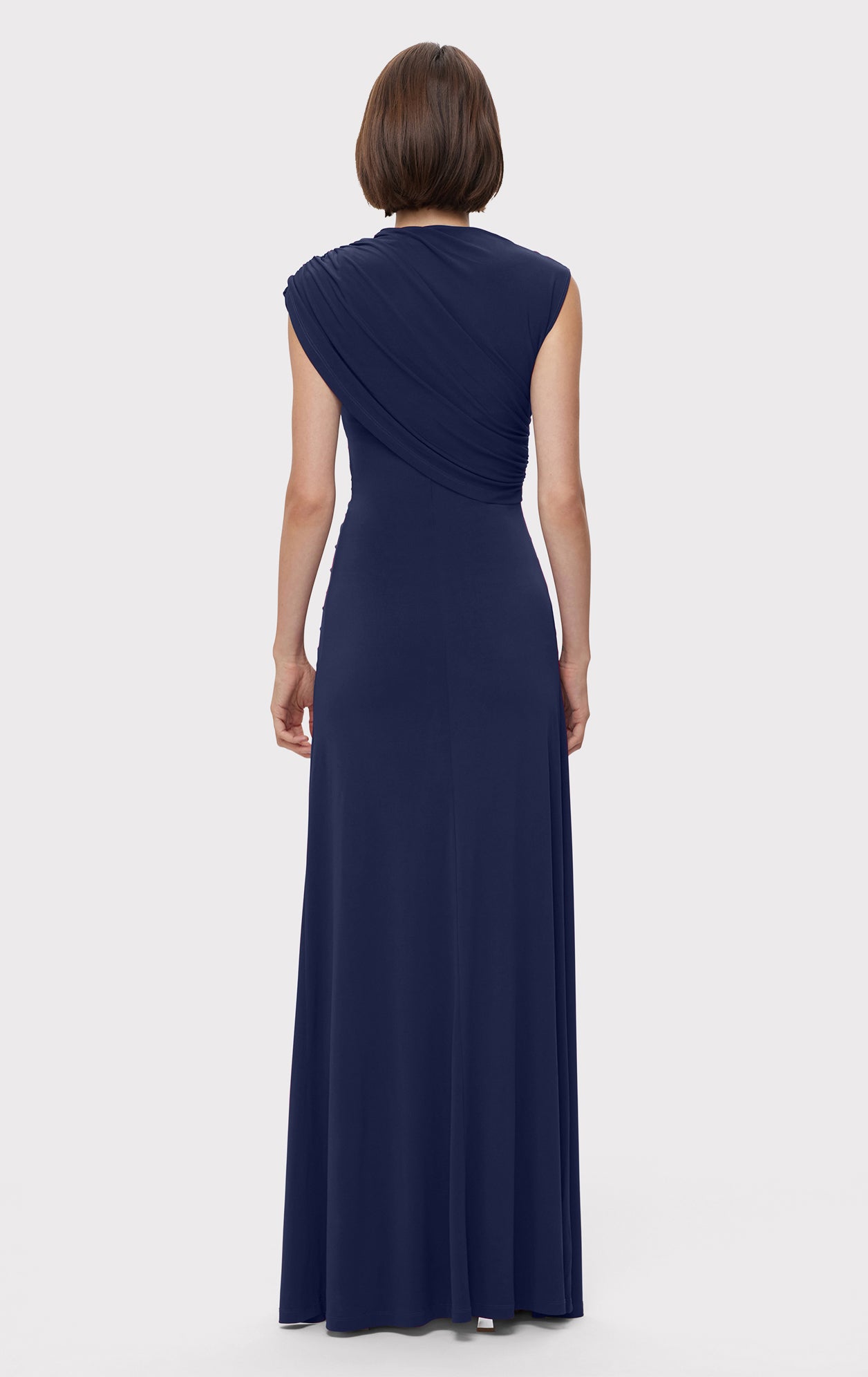 Cut from a lightweight, draped jersey, the body-skimming gown is complete with an asymmetrical neckline and ruching at the chest and hip. Finished with a high side slit.