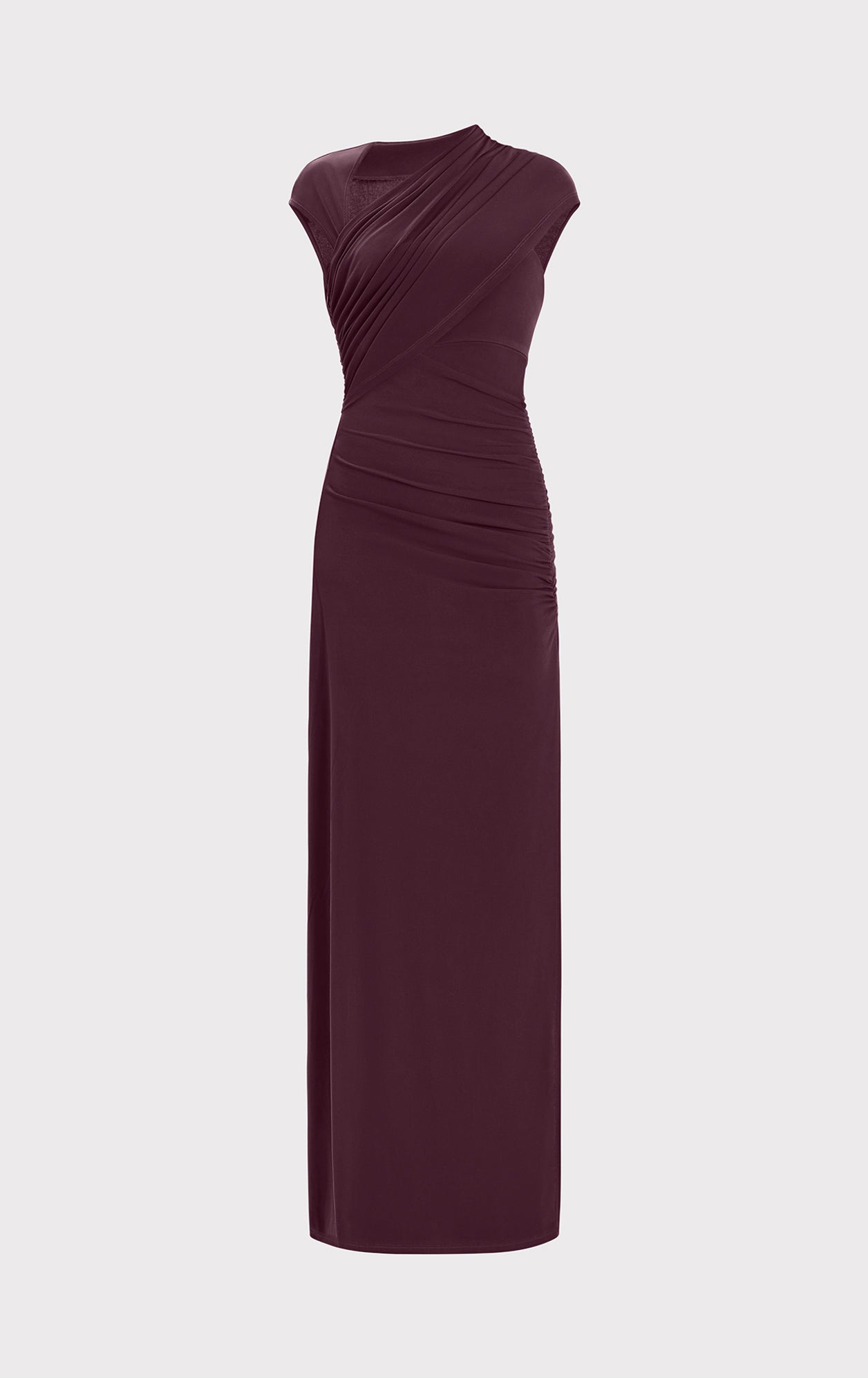 Cut from a lightweight, draped jersey, the body-skimming gown is complete with an asymmetrical neckline and ruching at the chest and hip. Finished with a high side slit.