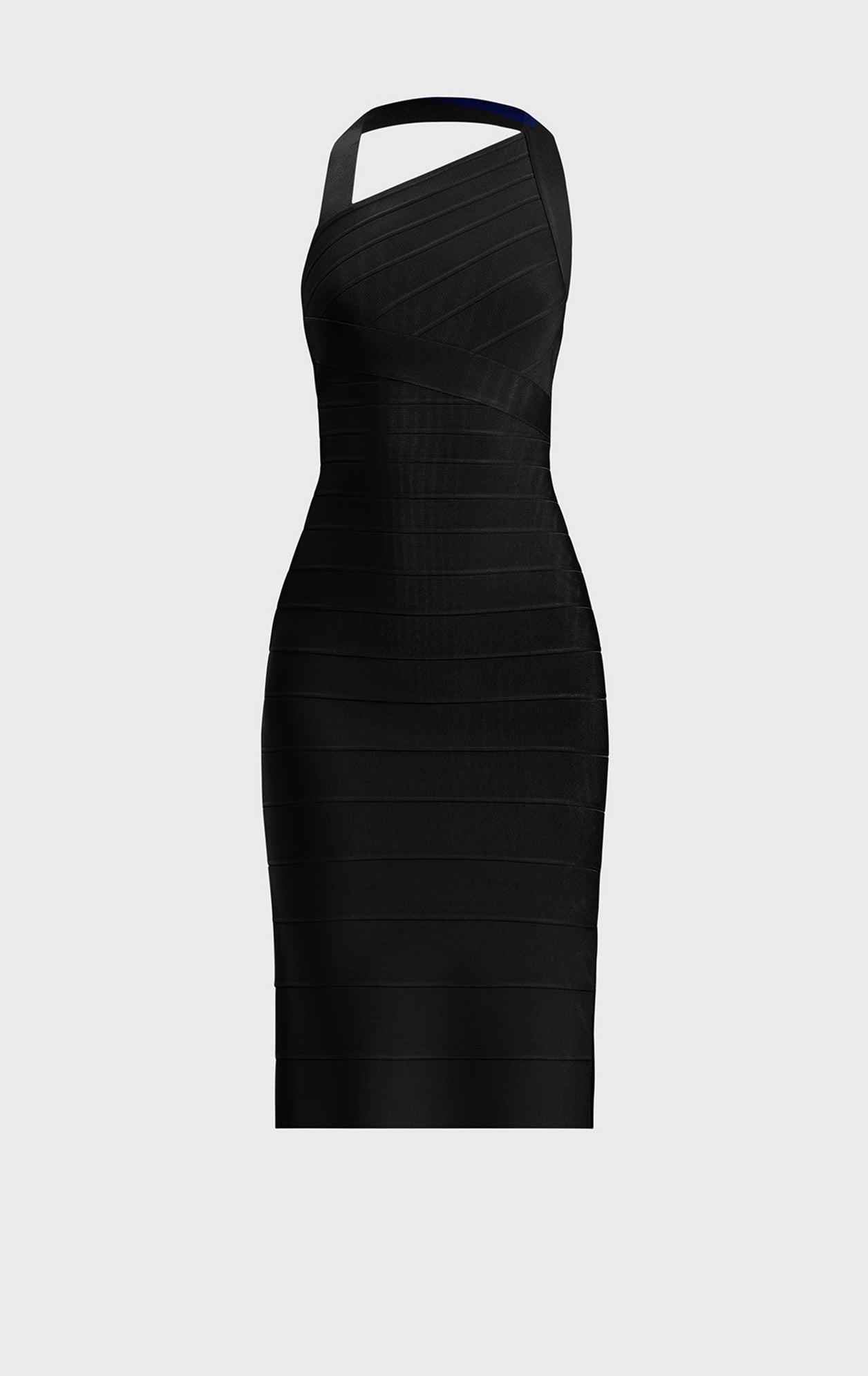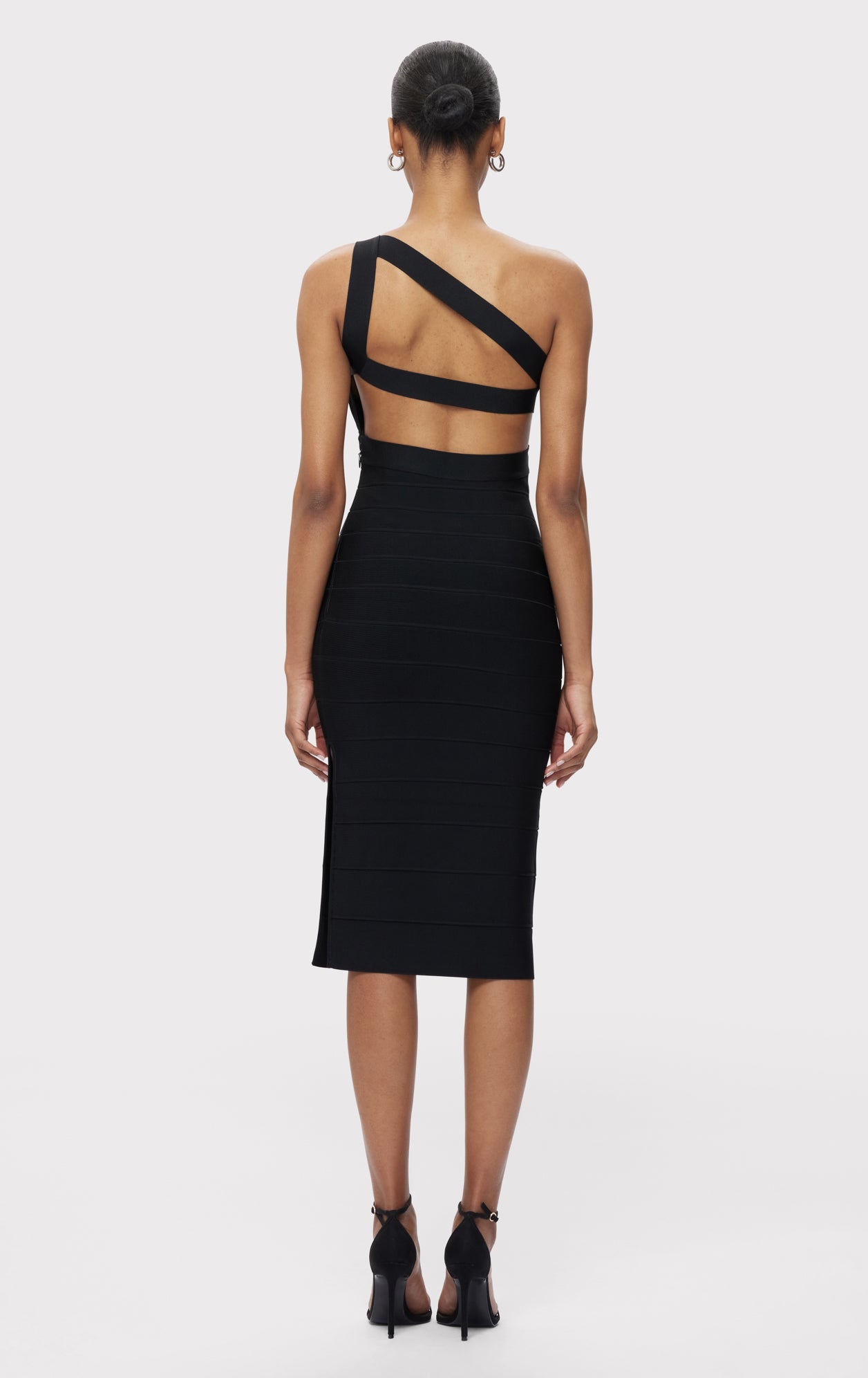 An asymmetrical neckline, side slit and exposed back define the Bella Dress. The midi silhouette is crafted from body-sculpting bandage with a side zip. Made with eco-friendly recycled yarns.