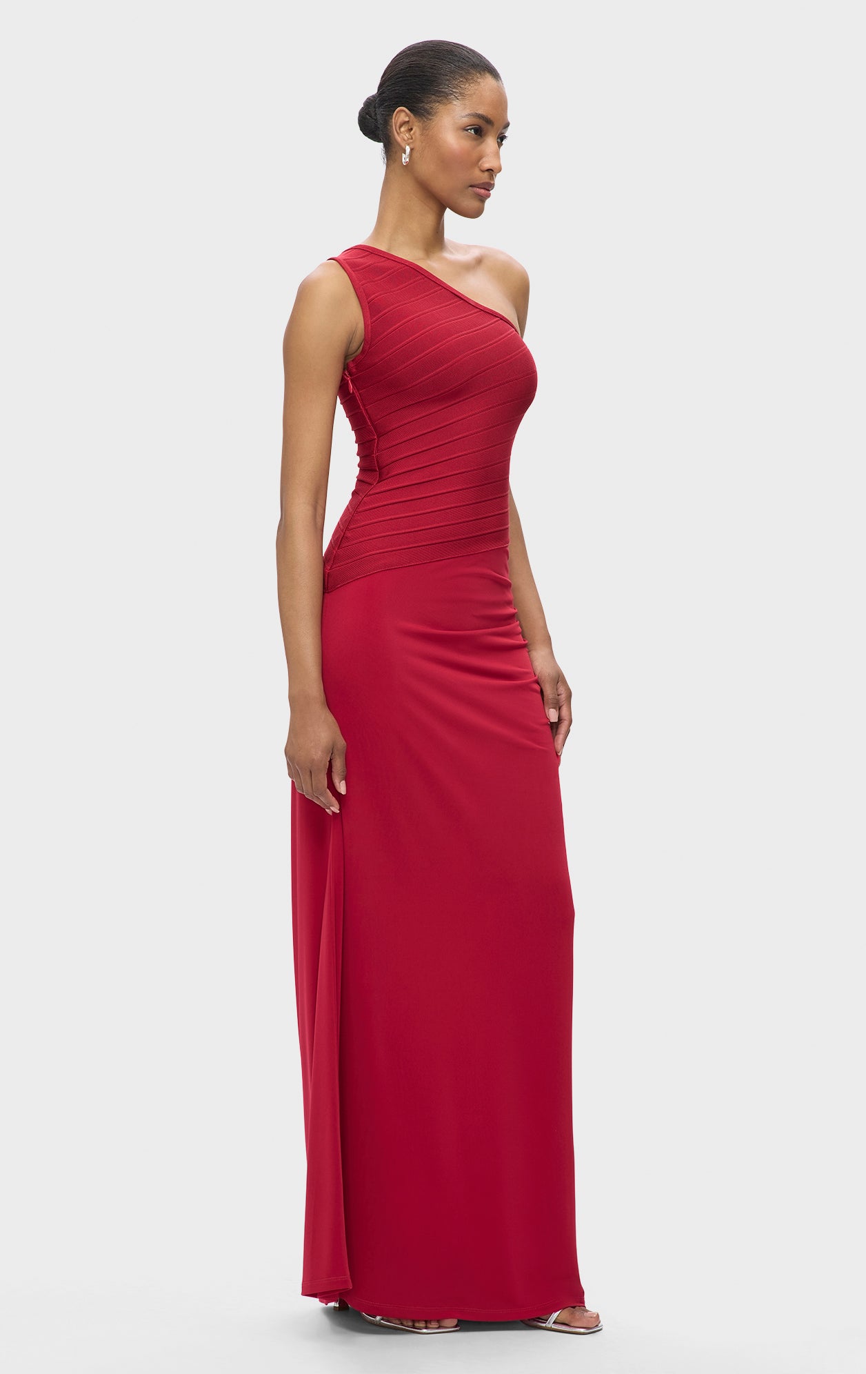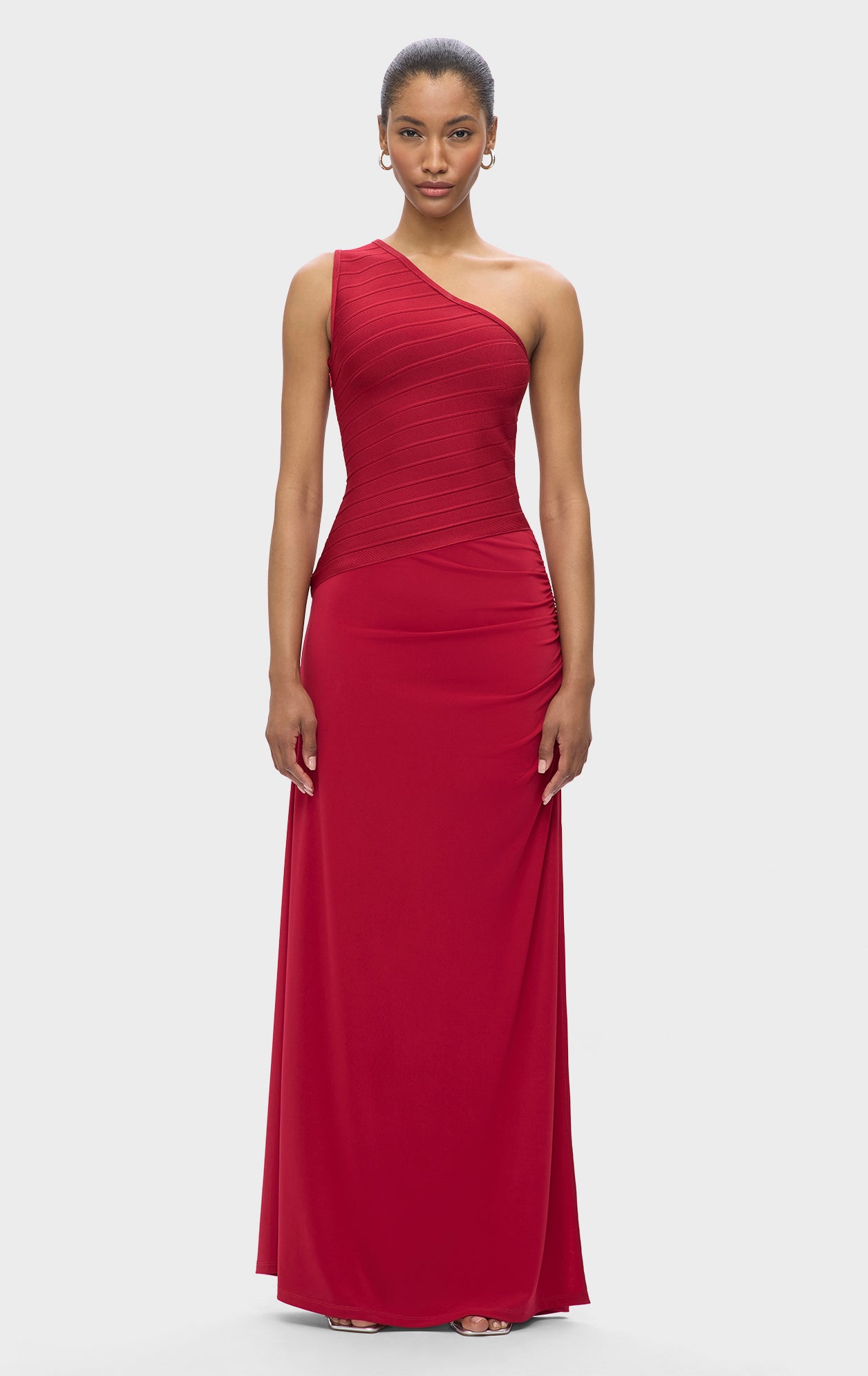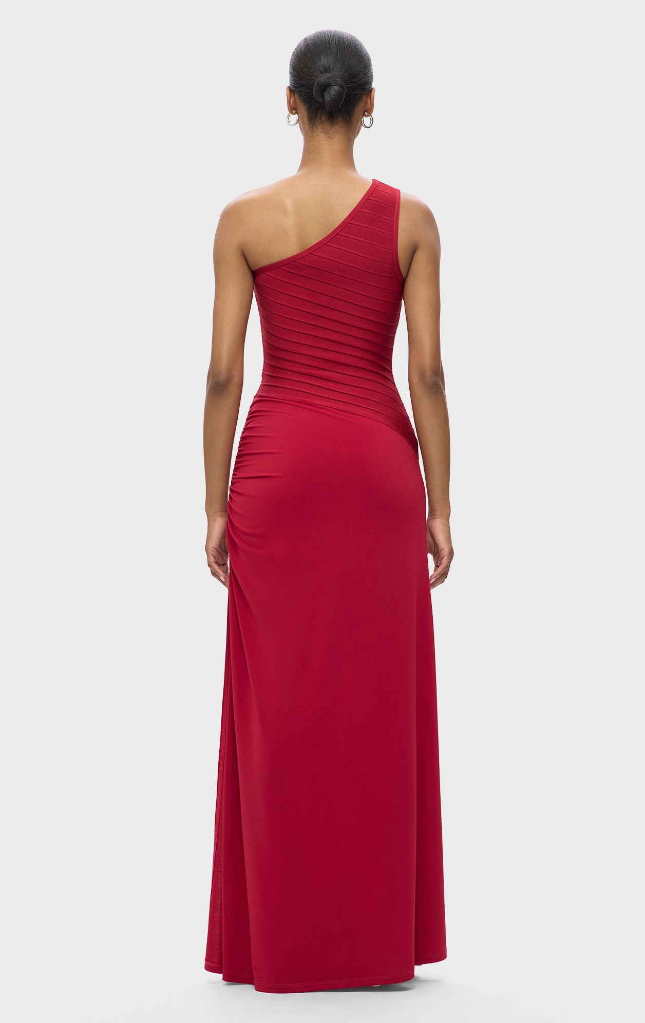 The Resort '25 Camellia Gown offers a timeless look with a bandage bodice featuring one-shoulder, asymmetrical styling. Finished with full-length jersey skirt, ruching along the hip and hidden side-zip. This bodice is made using recycled yarns to help reduce waste.