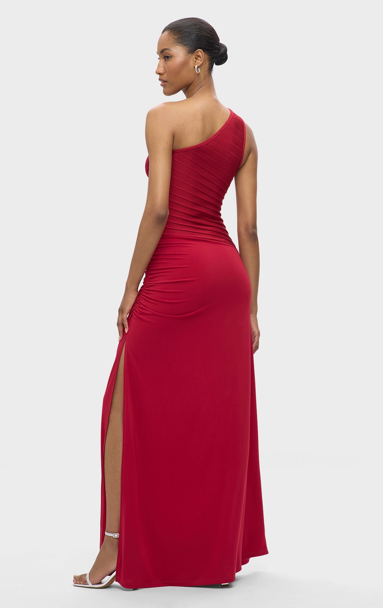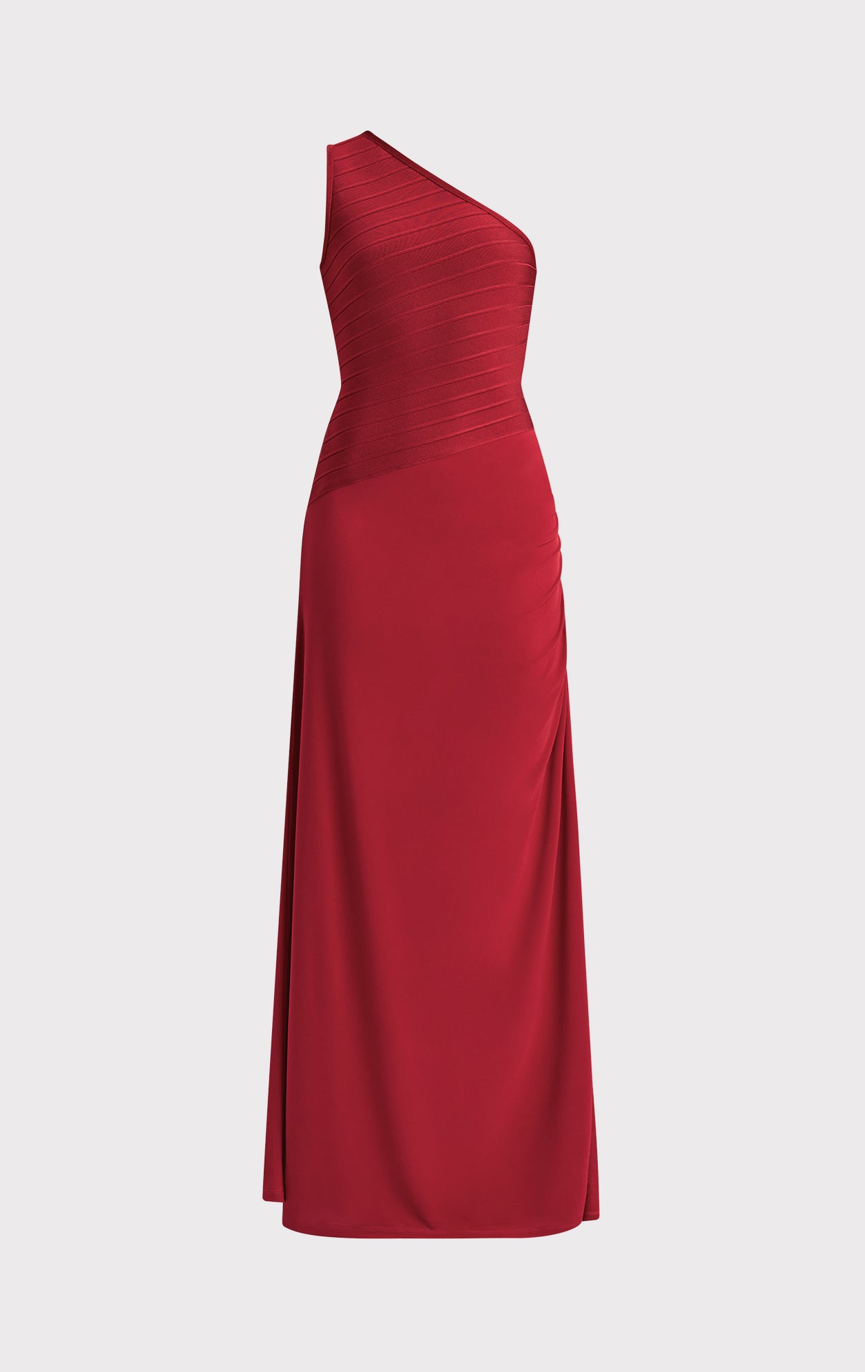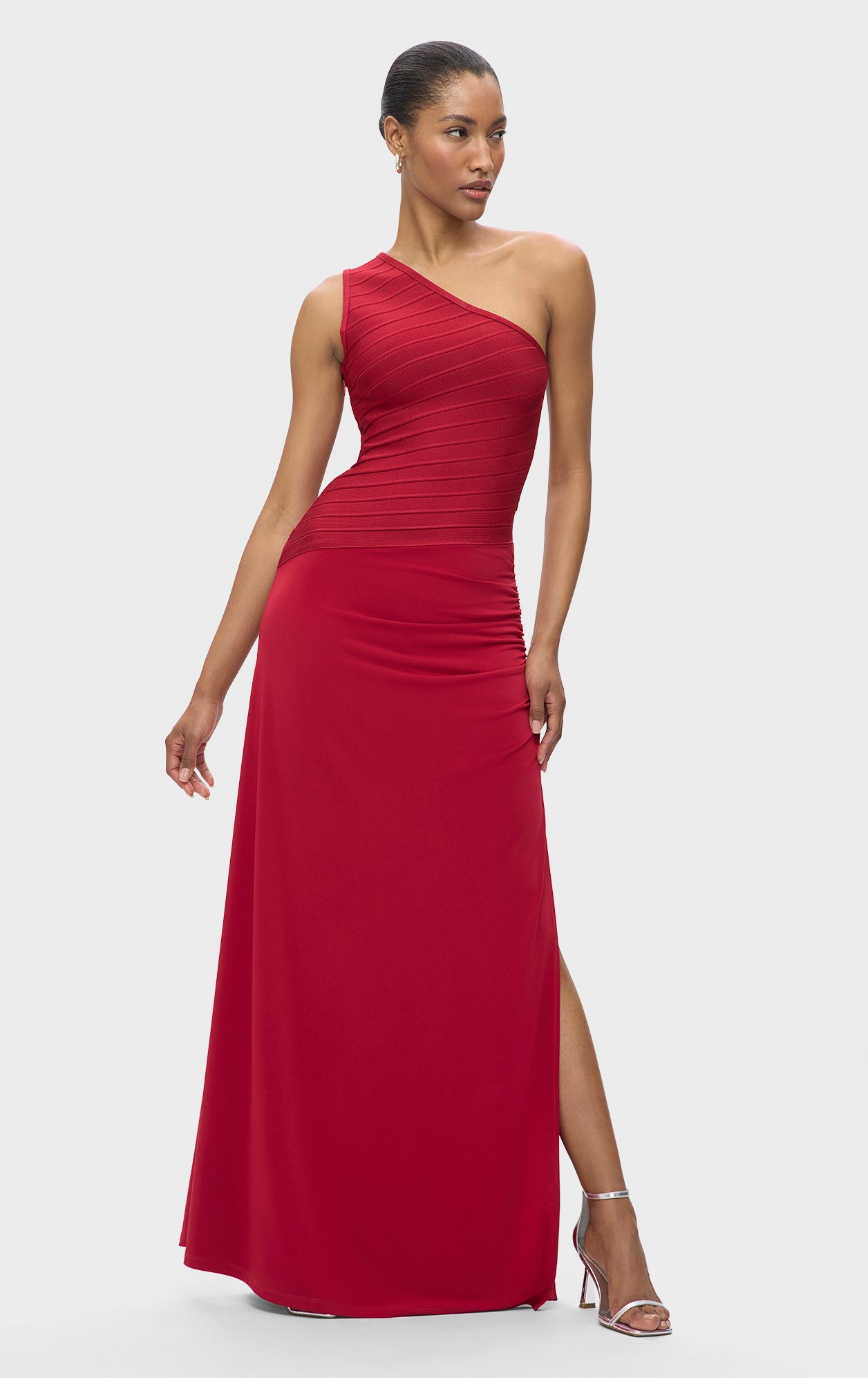 The Resort '25 Camellia Gown offers a timeless look with a bandage bodice featuring one-shoulder, asymmetrical styling. Finished with full-length jersey skirt, ruching along the hip and hidden side-zip. This bodice is made using recycled yarns to help reduce waste.
