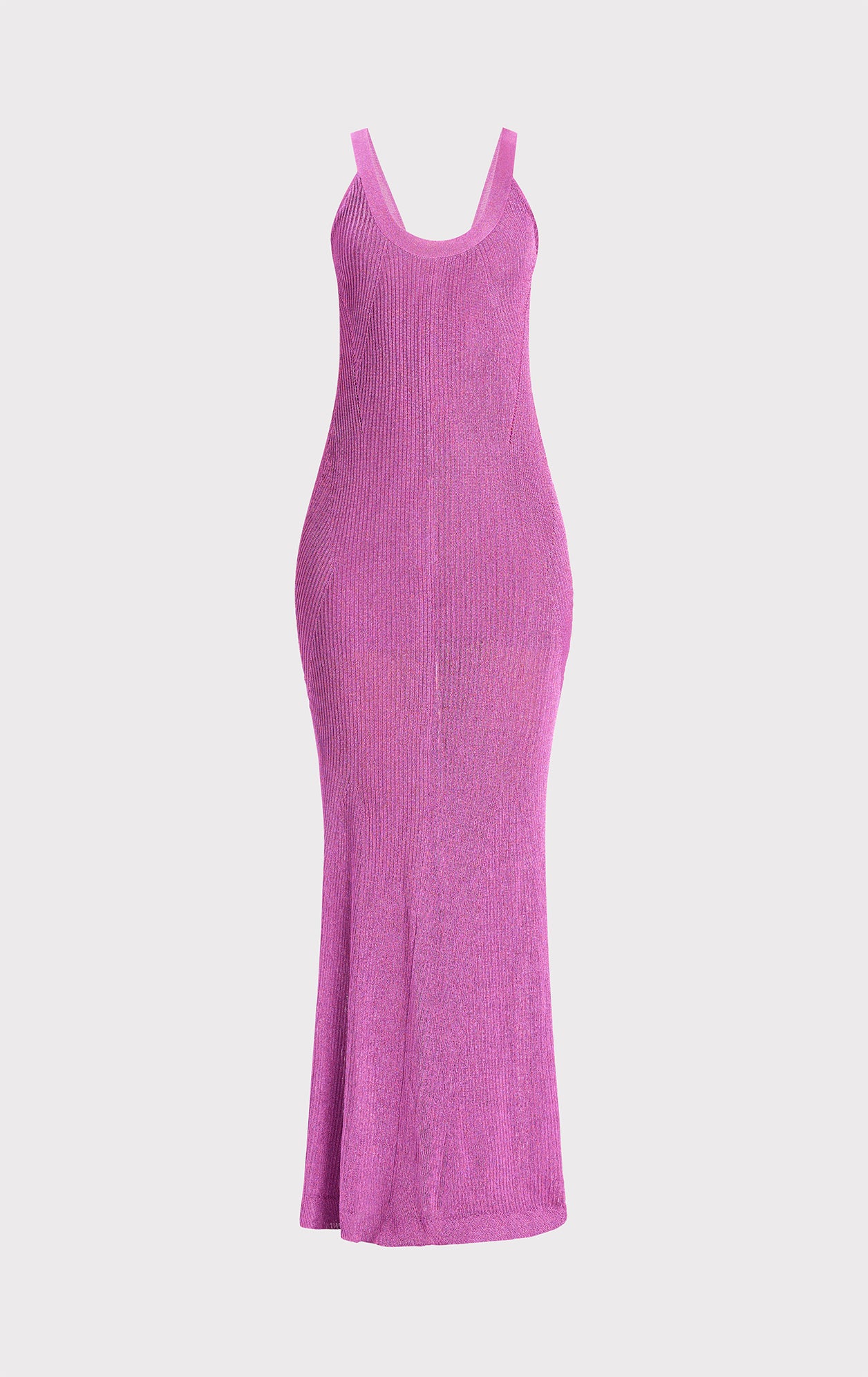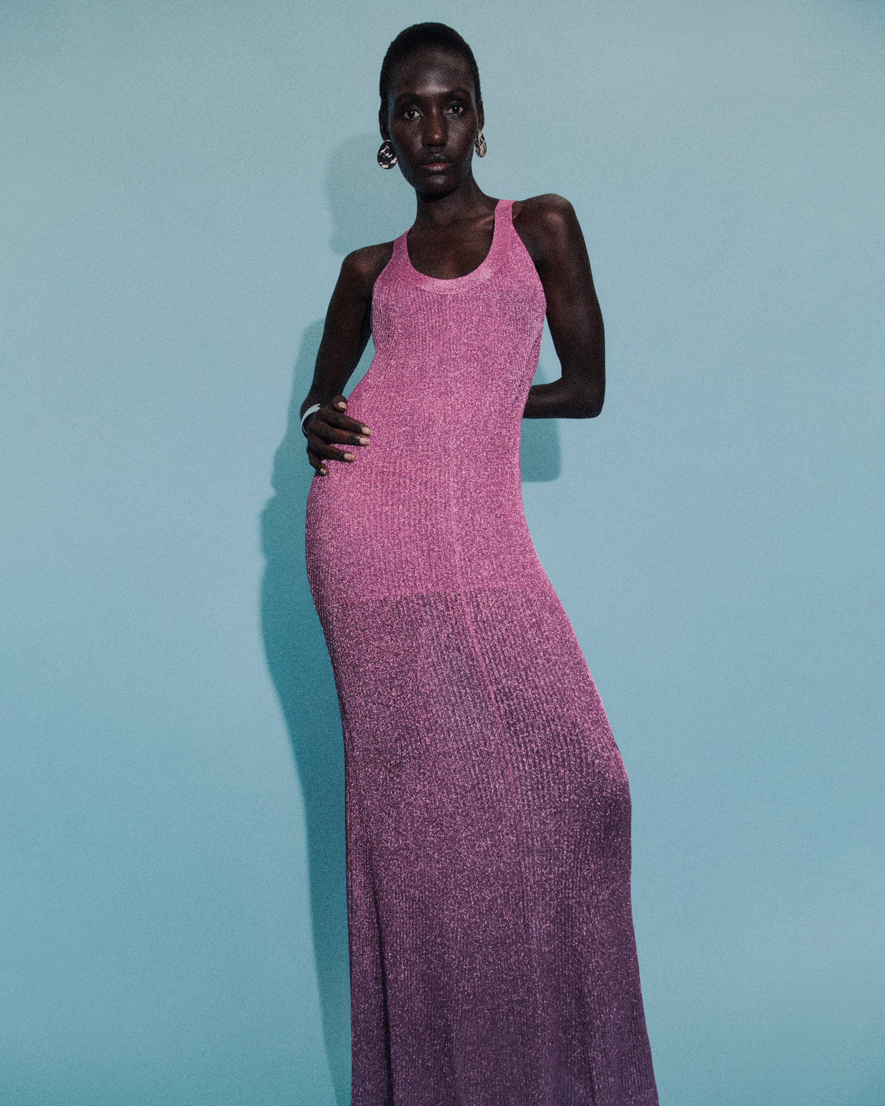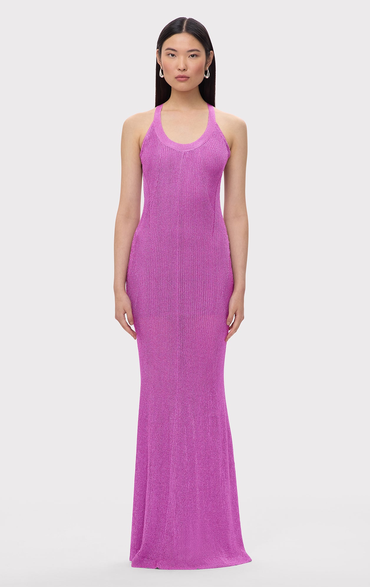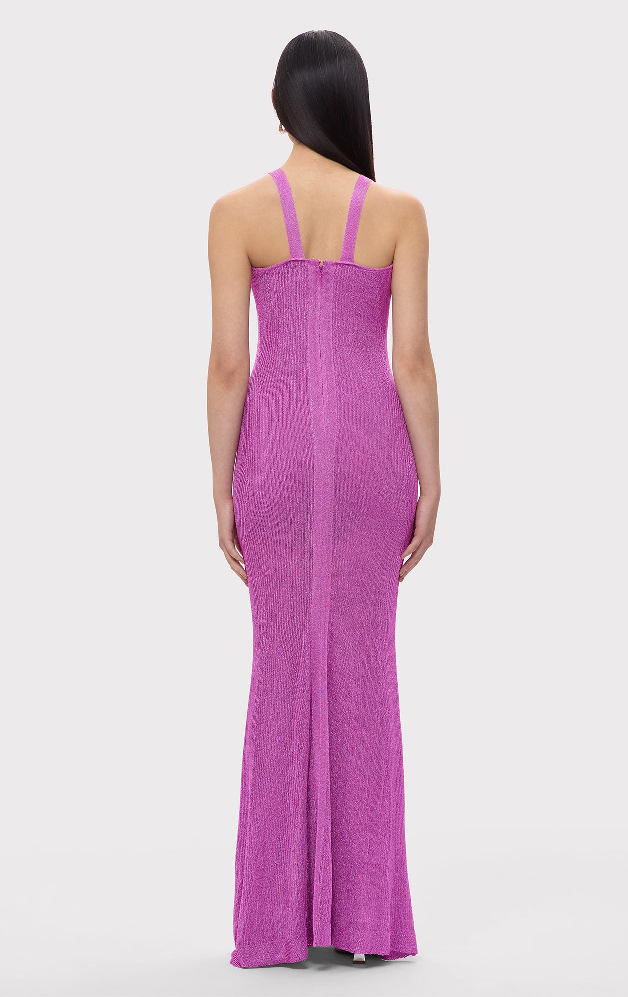 The Carmen Gown debuts for Spring '25 in a floor-sweeping silhouette cut from a lightweight metallic knit. A wide scoop neckline, partial lining and mermaid skirt give the gown a weightless effect. Finished with center-back zip.