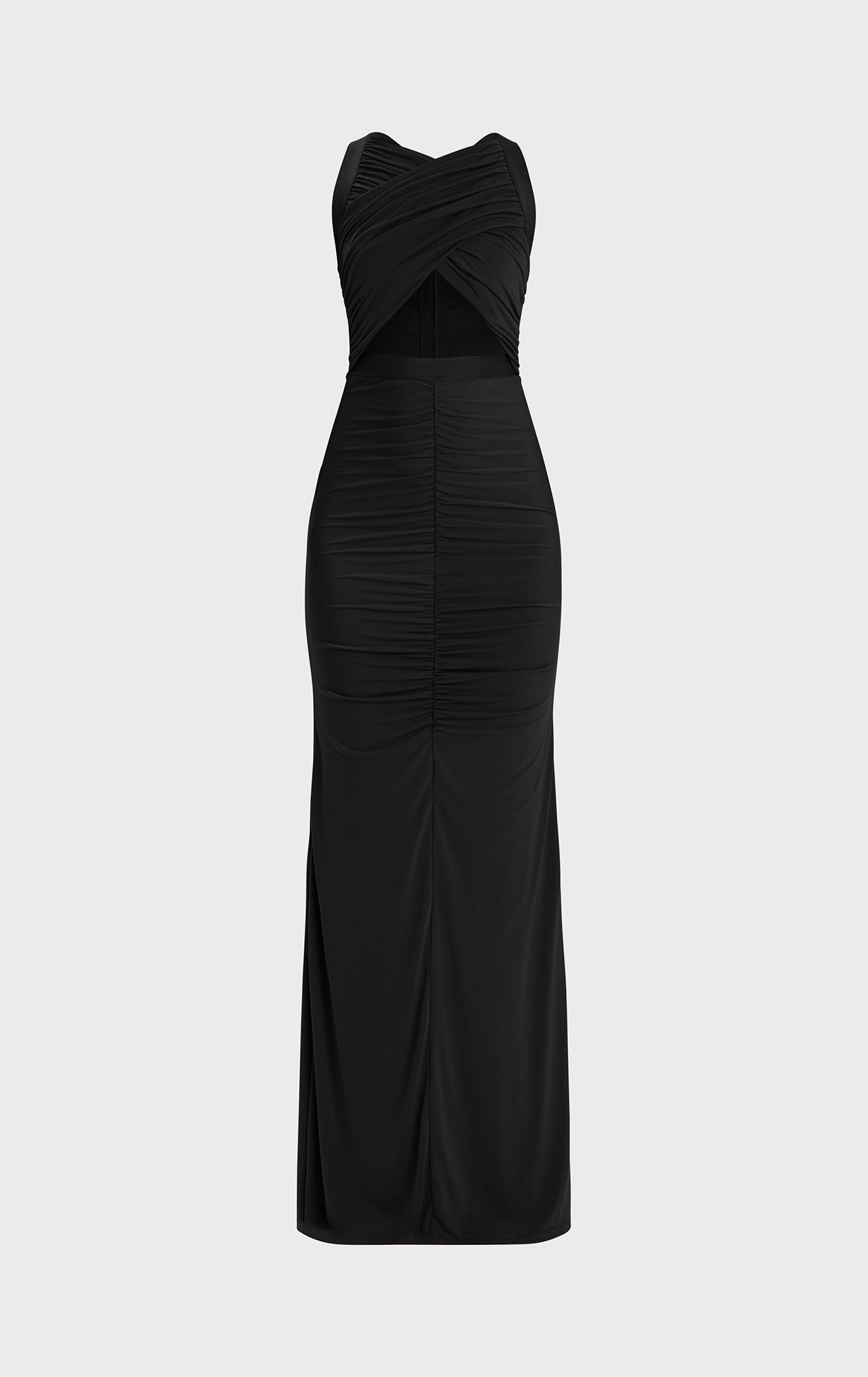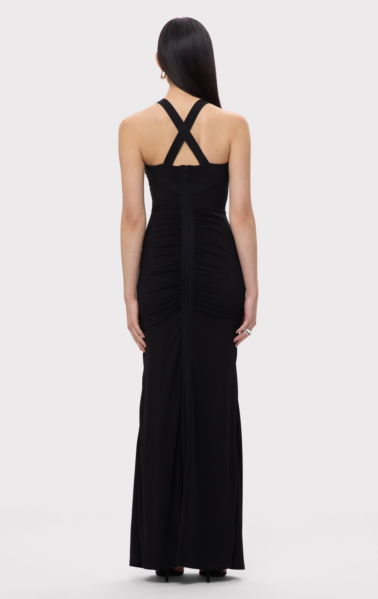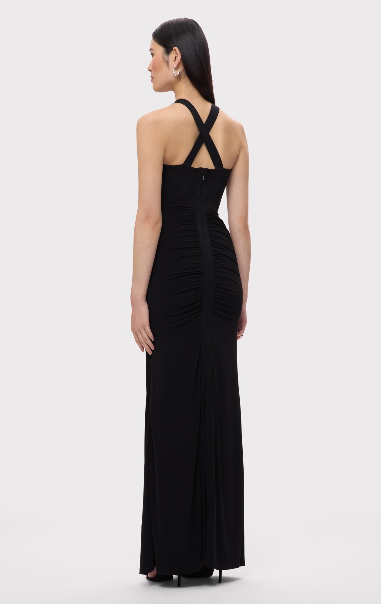 The Eden Gown is crafted from lightweight jersey, featuring center-front and back ruching with a bandage accent at the waistline. A criss-cross bodice design adds a striking, skin-baring effect at the midsection. The look is finished with a back slit and center-back zip.