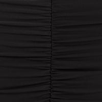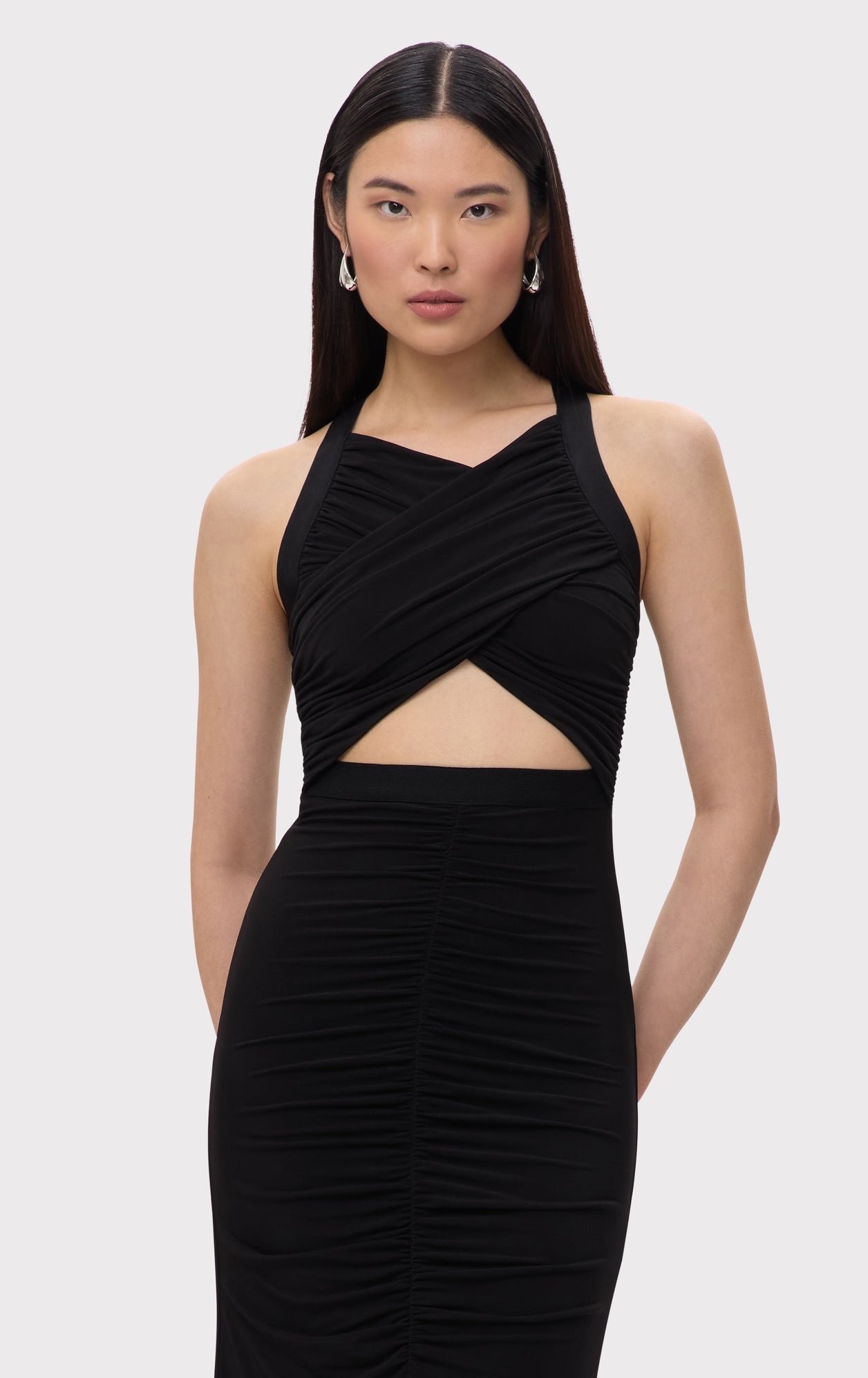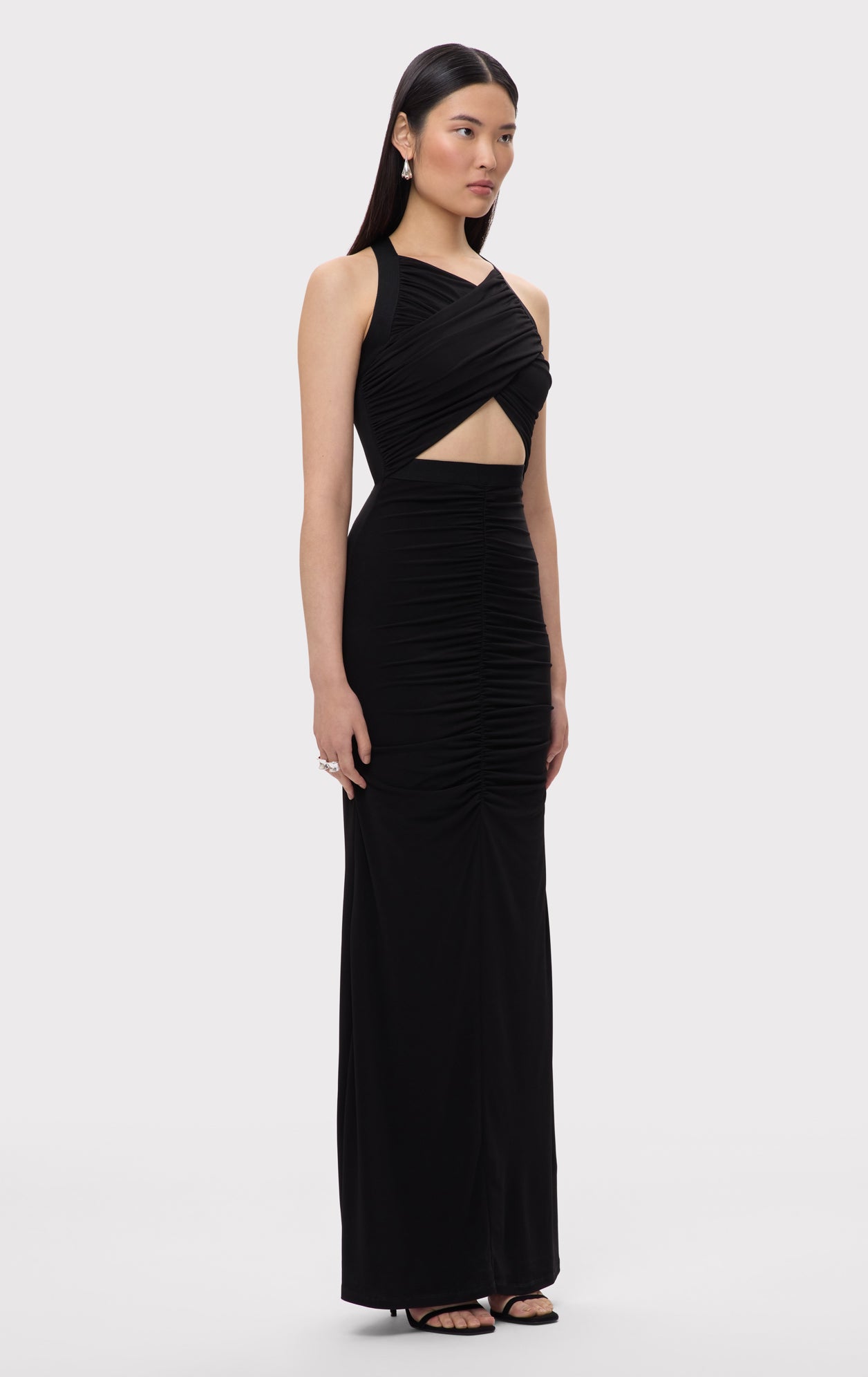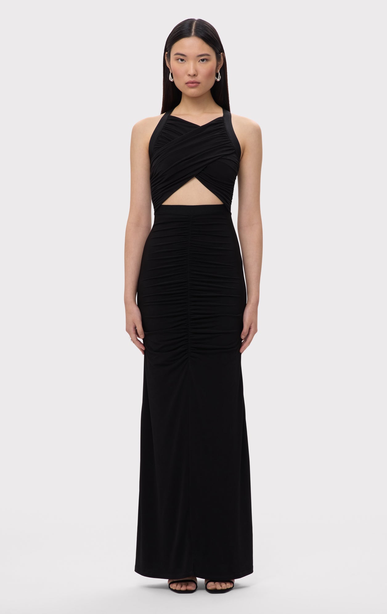 The Eden Gown is crafted from lightweight jersey, featuring center-front and back ruching with a bandage accent at the waistline. A criss-cross bodice design adds a striking, skin-baring effect at the midsection. The look is finished with a back slit and center-back zip.