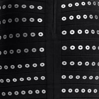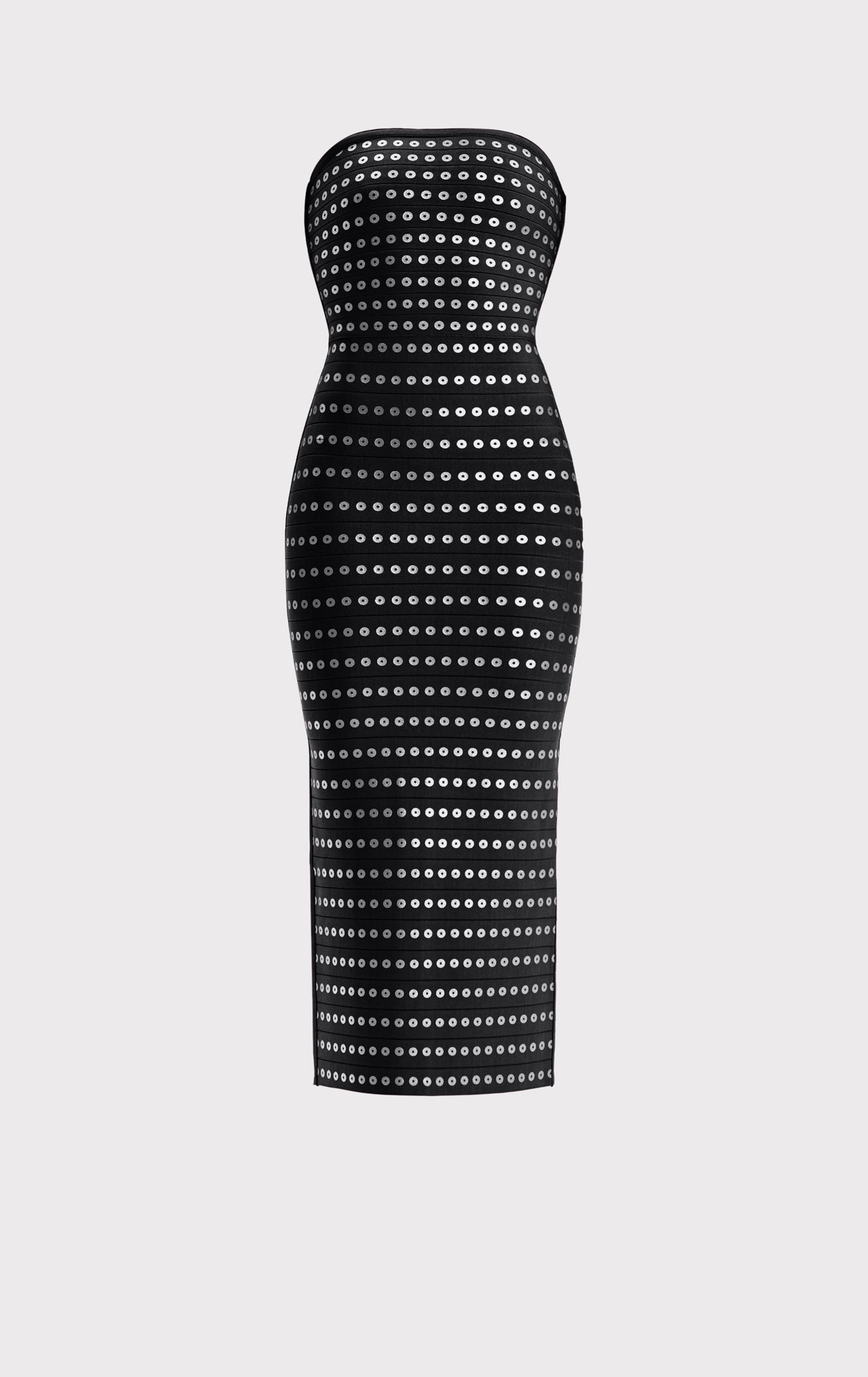 The Eira Dress, part of the Resort '26 collection, features a midi-length column silhouette in body-contouring bandage knit. The strapless design is detailed with a foil grommet print and finished with a back slit and center-back zip.