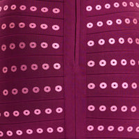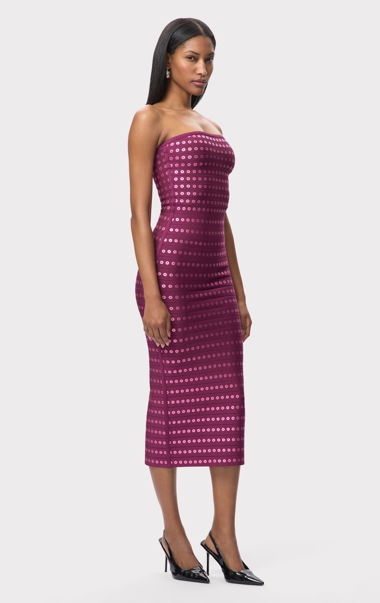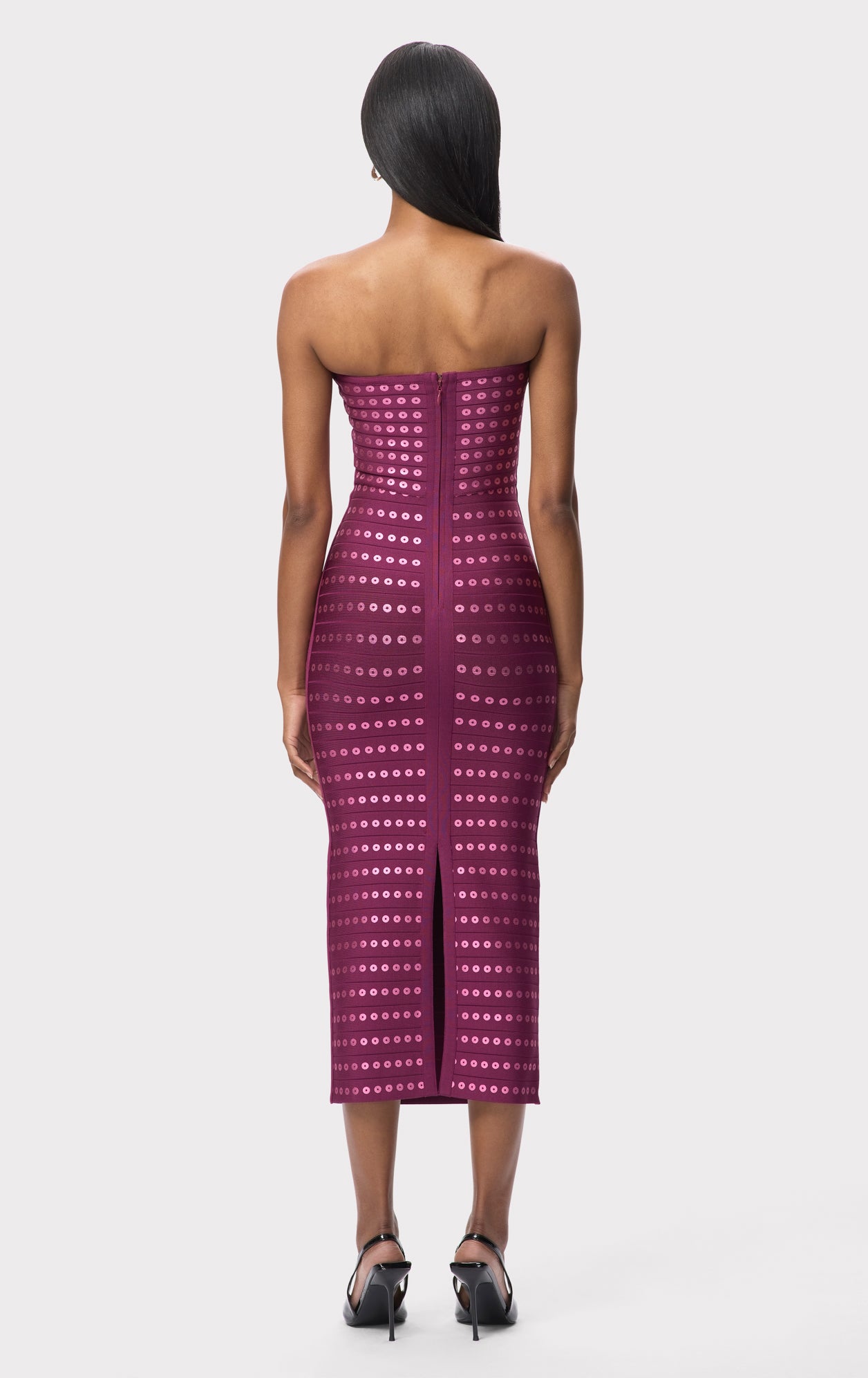 The Eira Dress, part of the Resort '26 collection, features a midi-length column silhouette in body-contouring bandage knit. The strapless design is detailed with a foil grommet print and finished with a back slit and center-back zip.