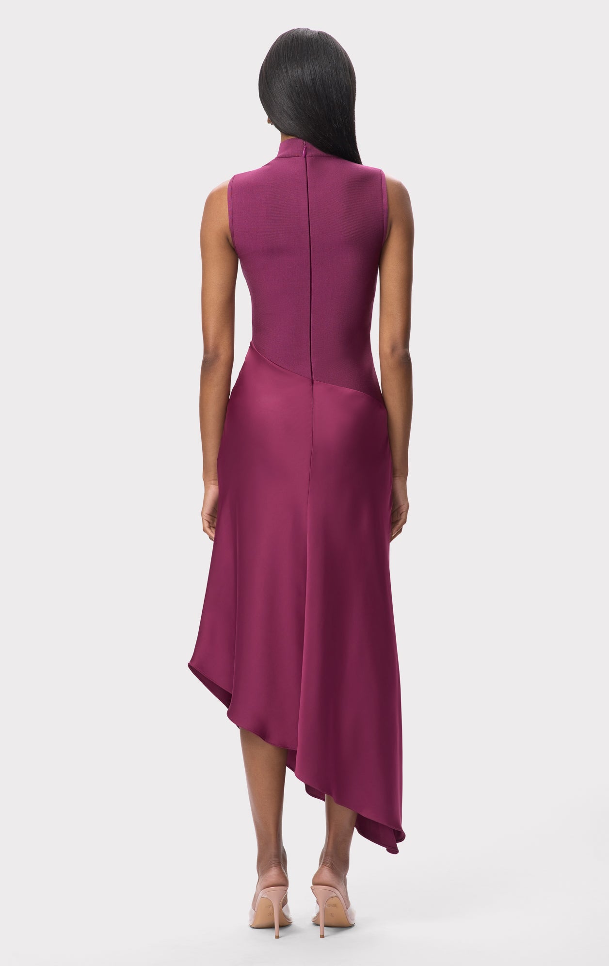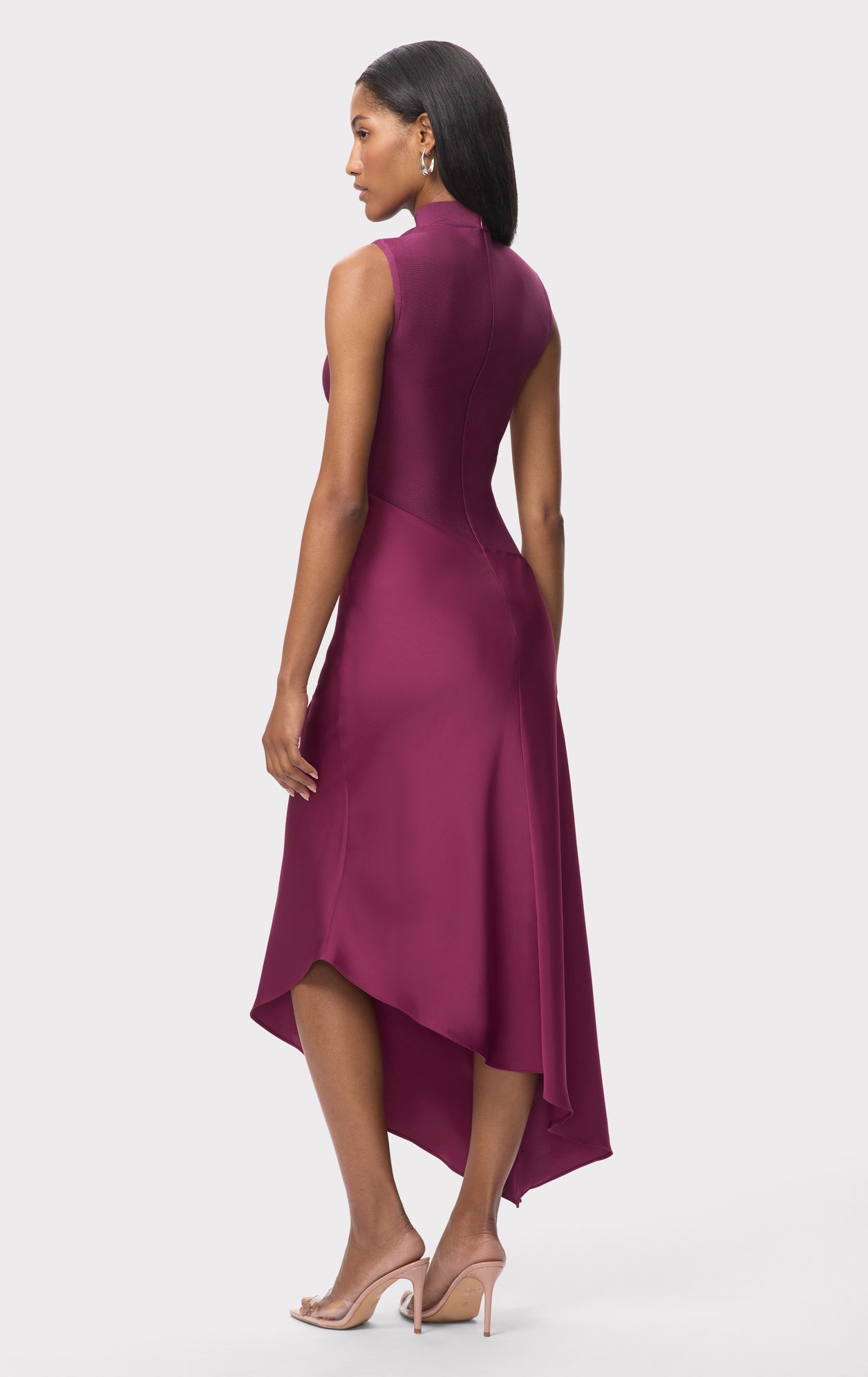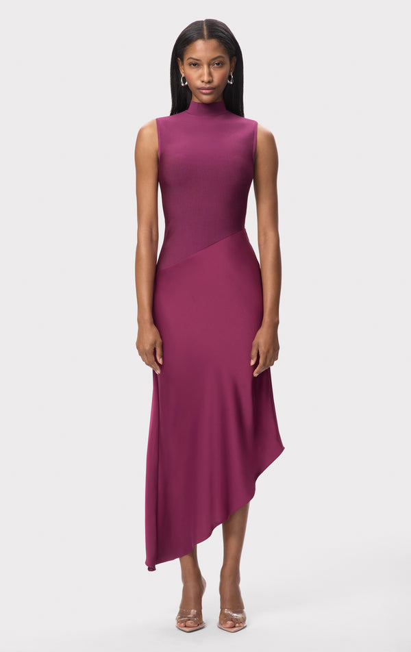 As seen in Look 16 of the Resort '26 Lookbook, the Esme Dress is a chic silhouette cut from a compact knit with a liquid satin skirt. Features a mock neckline and an asymmetrical hem. The sleeveless dress is finished with a center-back zip.
