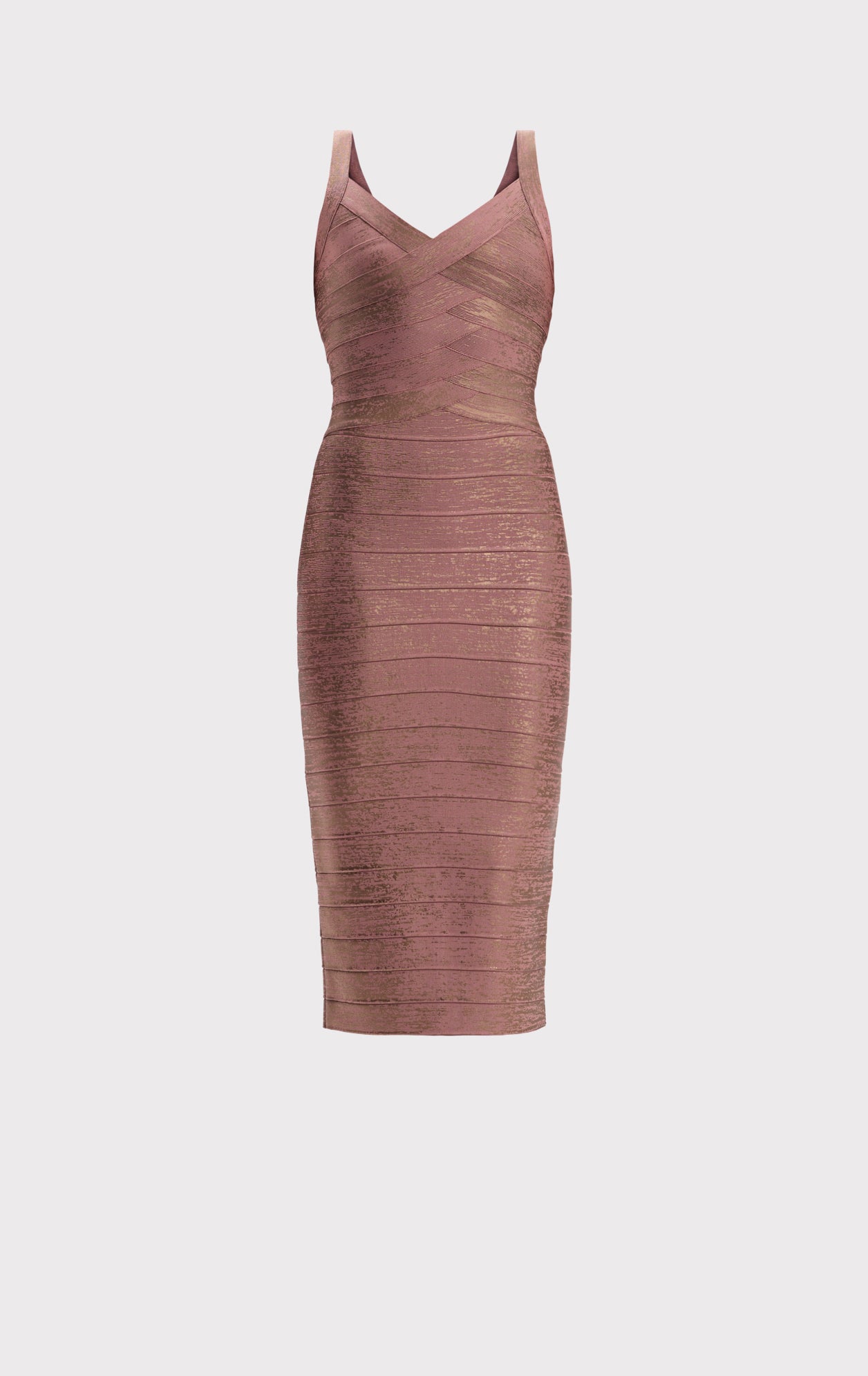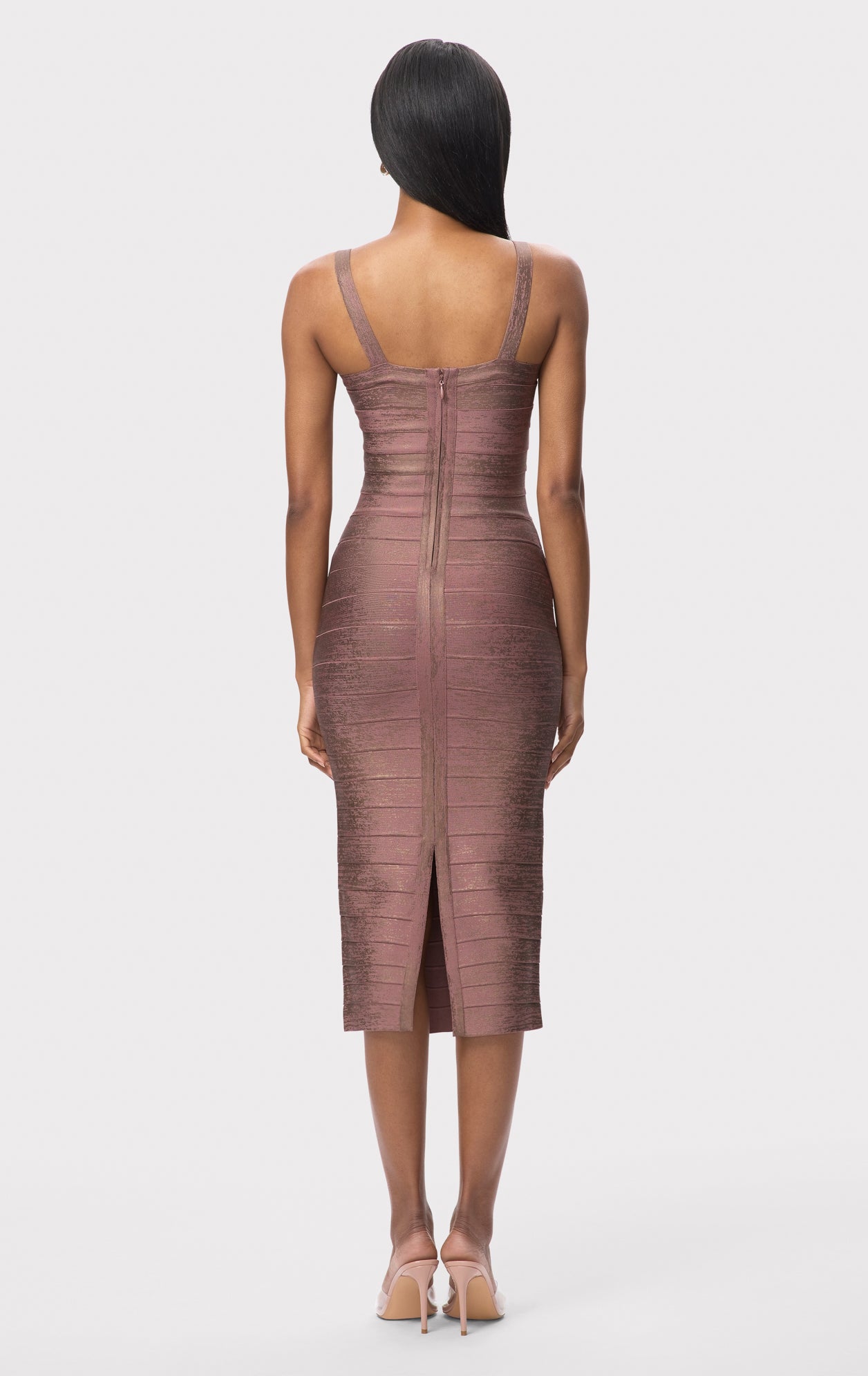 The Indi Dress, as seen in Look 17 of the Resort '26 Lookbook, is a body-sculpting midi cut from tonal foil print bandage with a true bandage bodice. Finished with a back slit and center-back zip.