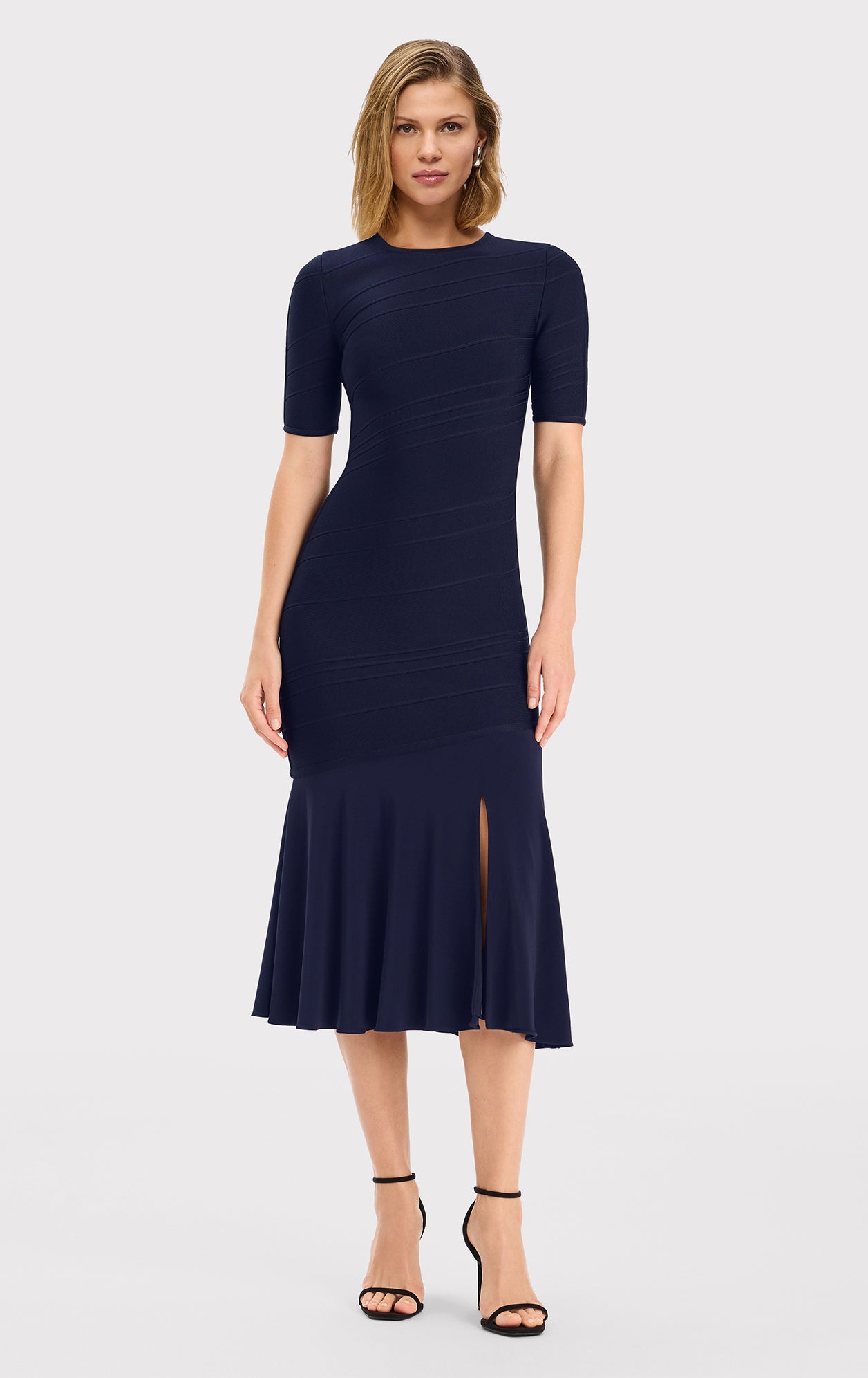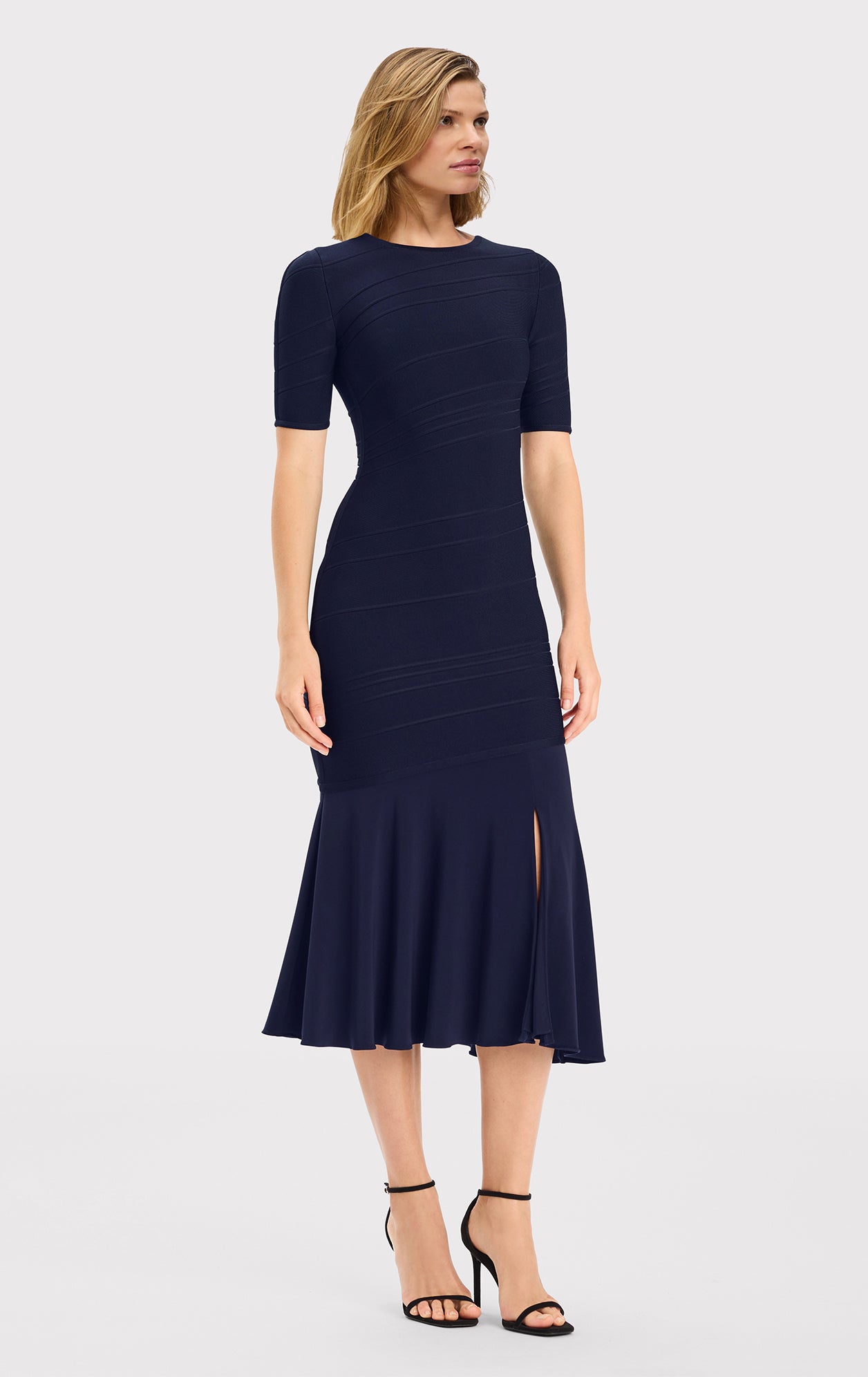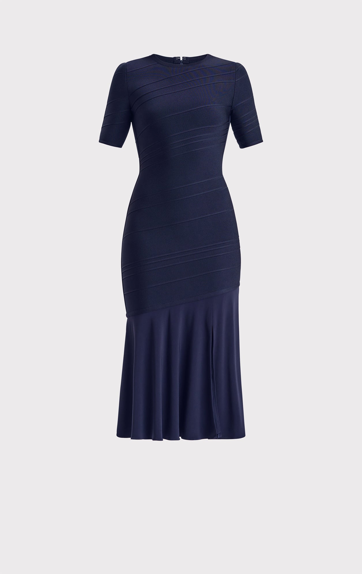 The Isabel Dress, new for Resort '25, features a bandage bodice designed to shape and sculpt the body with a flared jersey hem. A diagonal front slit and center-back zip finish the look.
