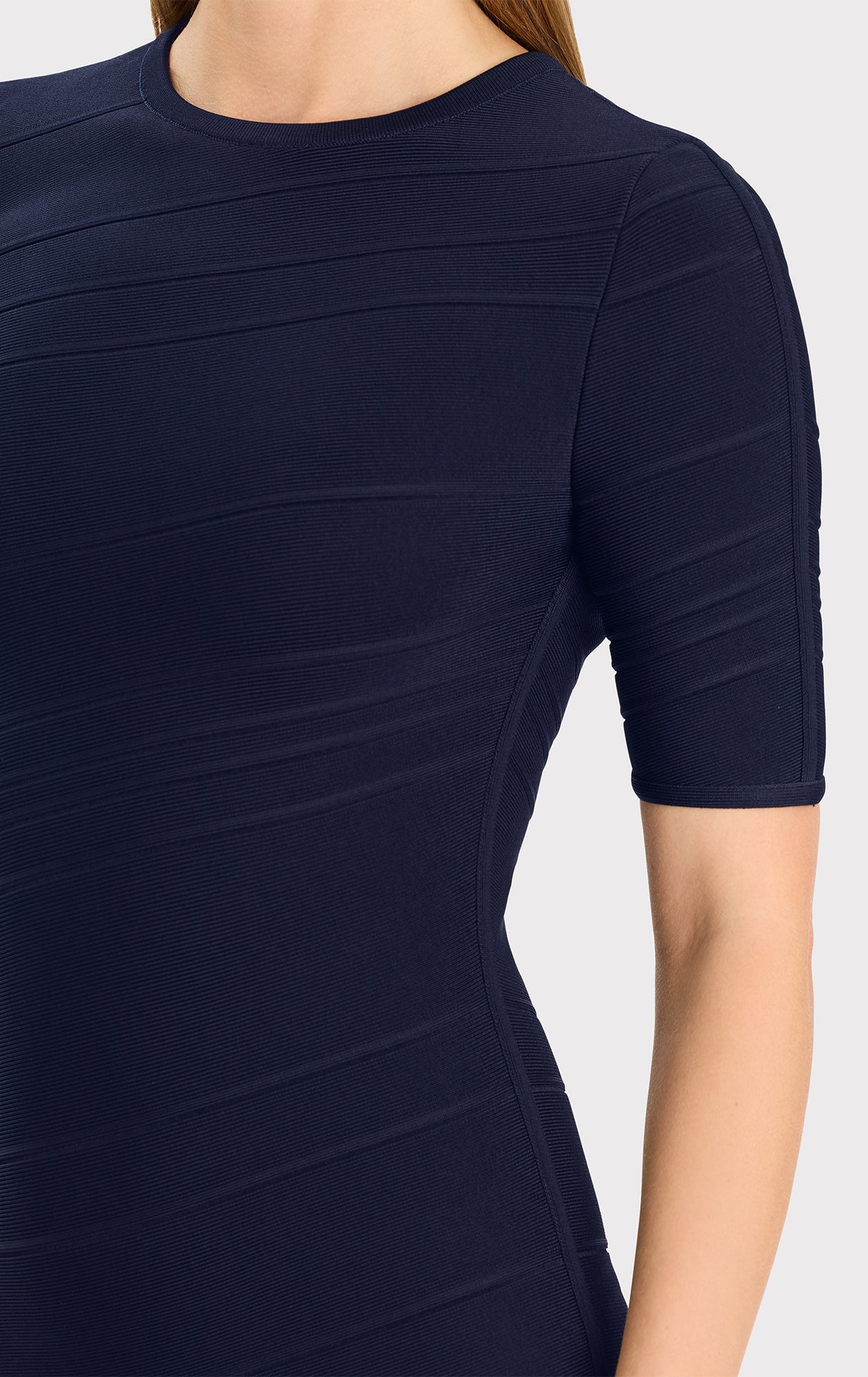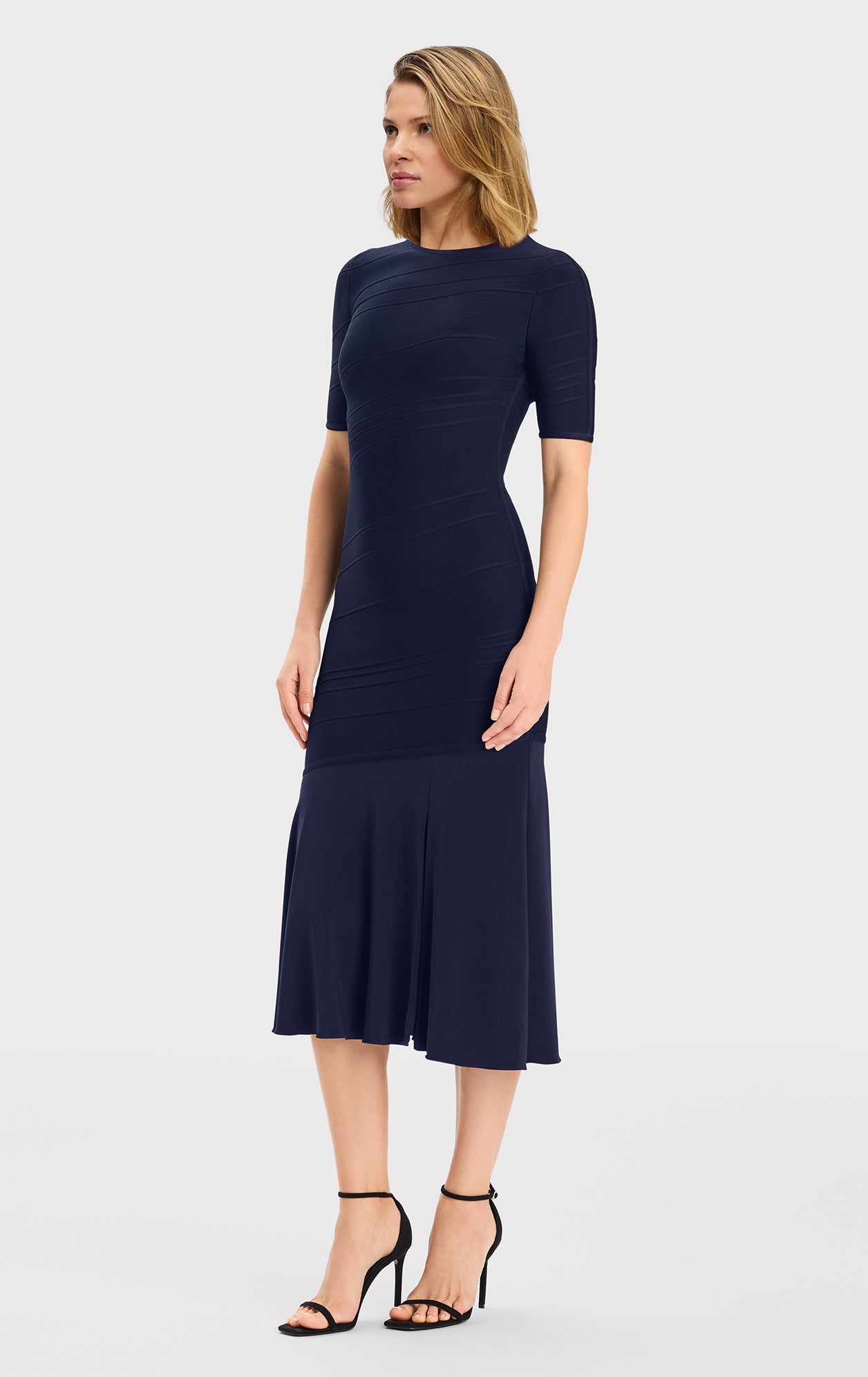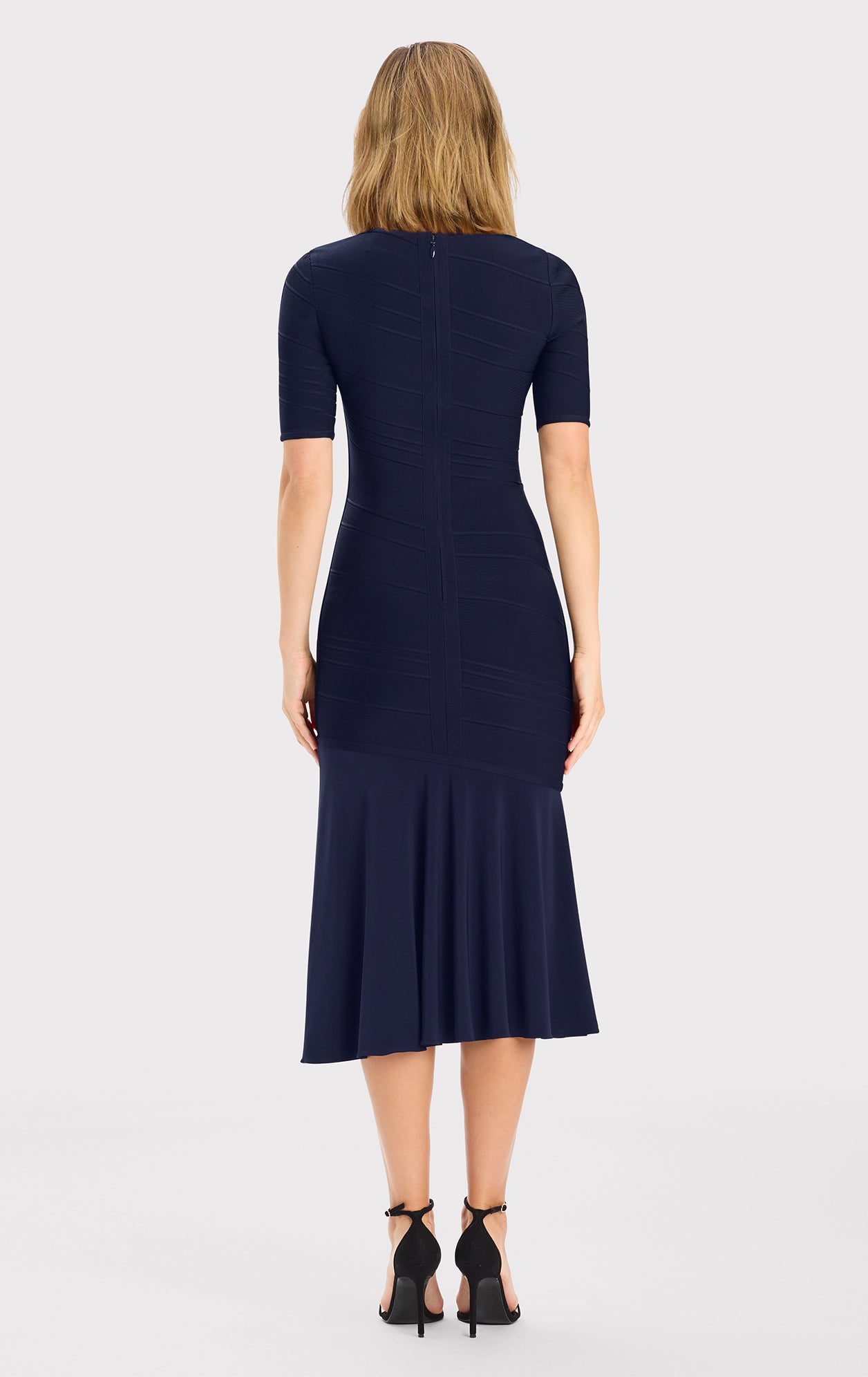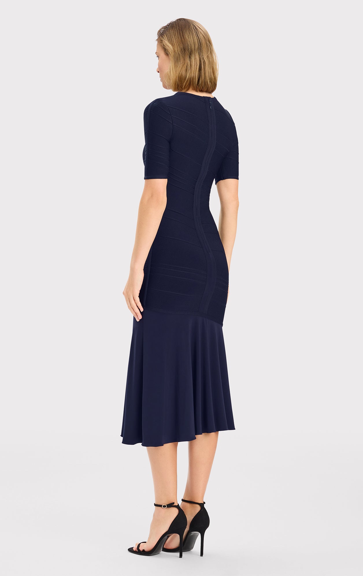 The Isabel Dress, new for Resort '25, features a bandage bodice designed to shape and sculpt the body with a flared jersey hem. A diagonal front slit and center-back zip finish the look.
