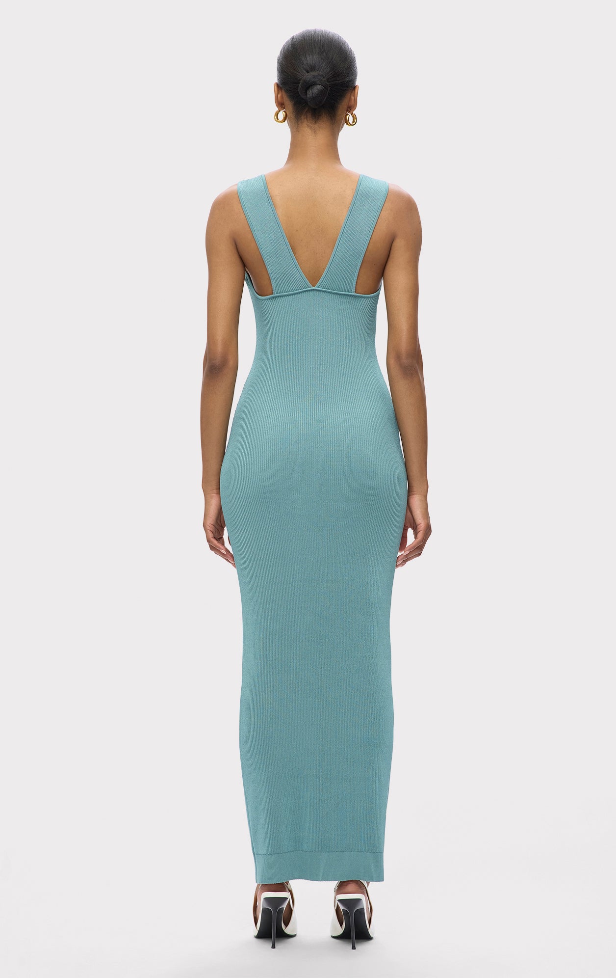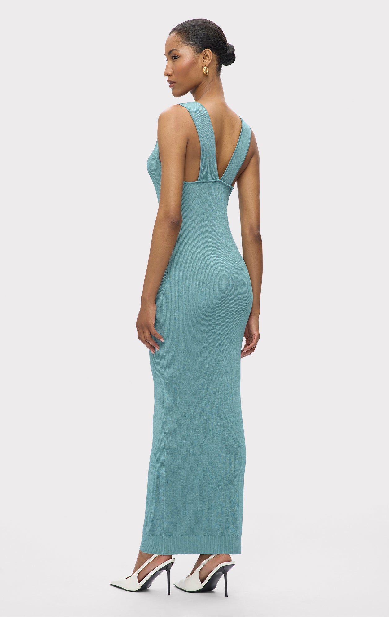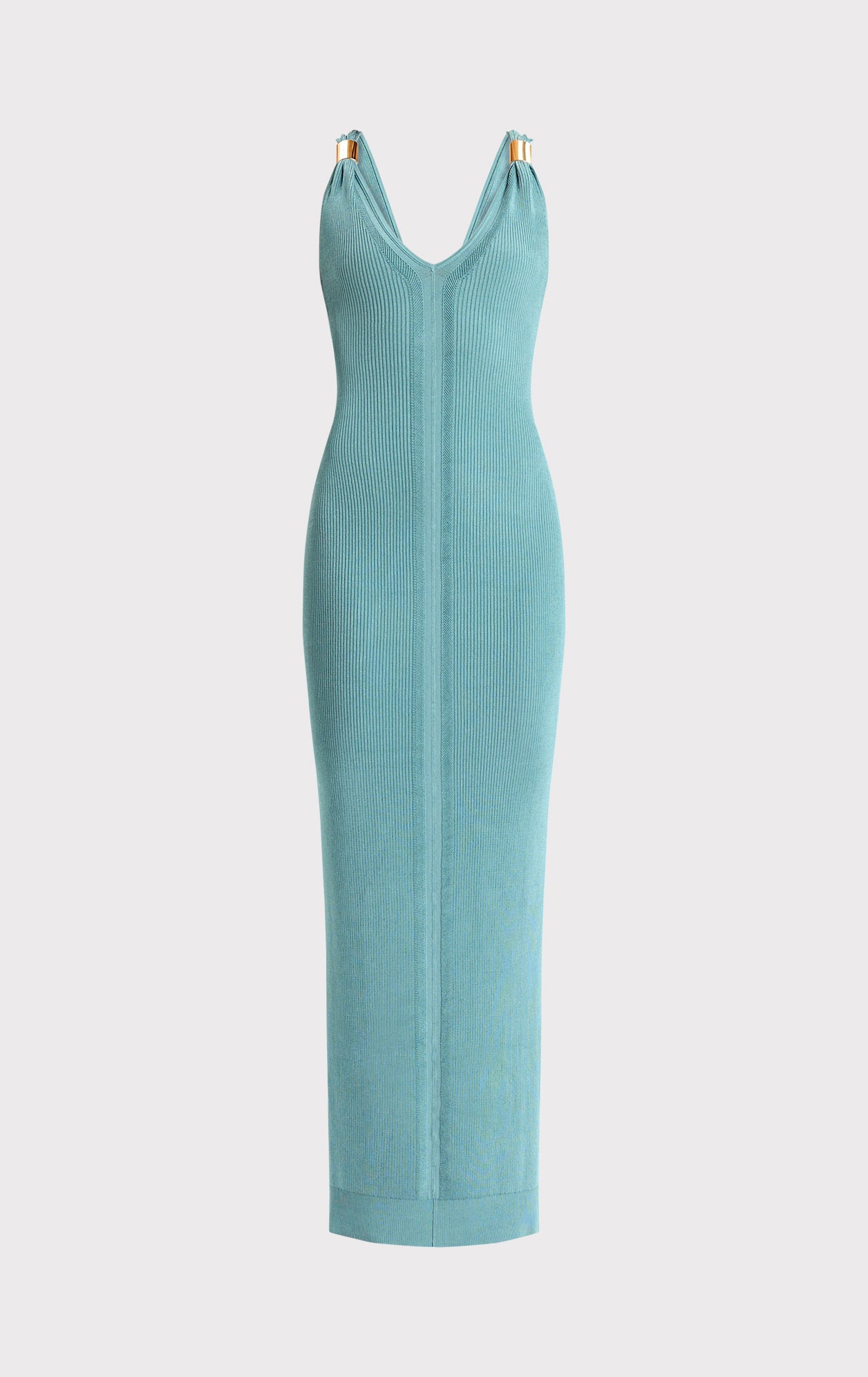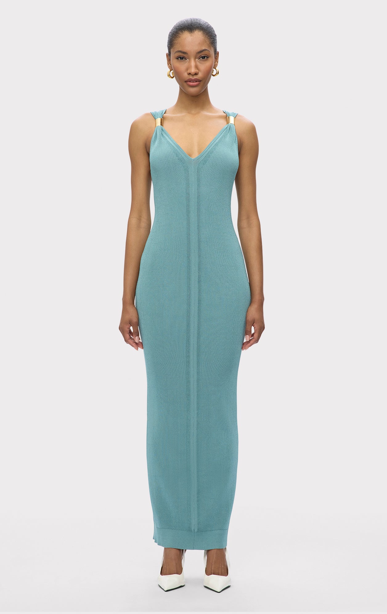 Part of the Resort '25 collection, the Kerri Gown is cut in a body-skimming rib knit. The floor-length gown is accented with a deep v-neckline, gold hardware and wide back straps. Made with eco-friendly recycled yarns.
