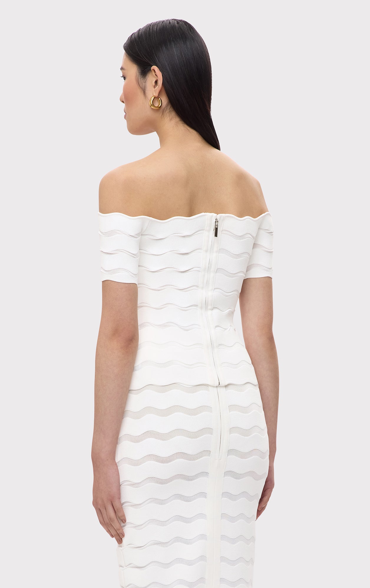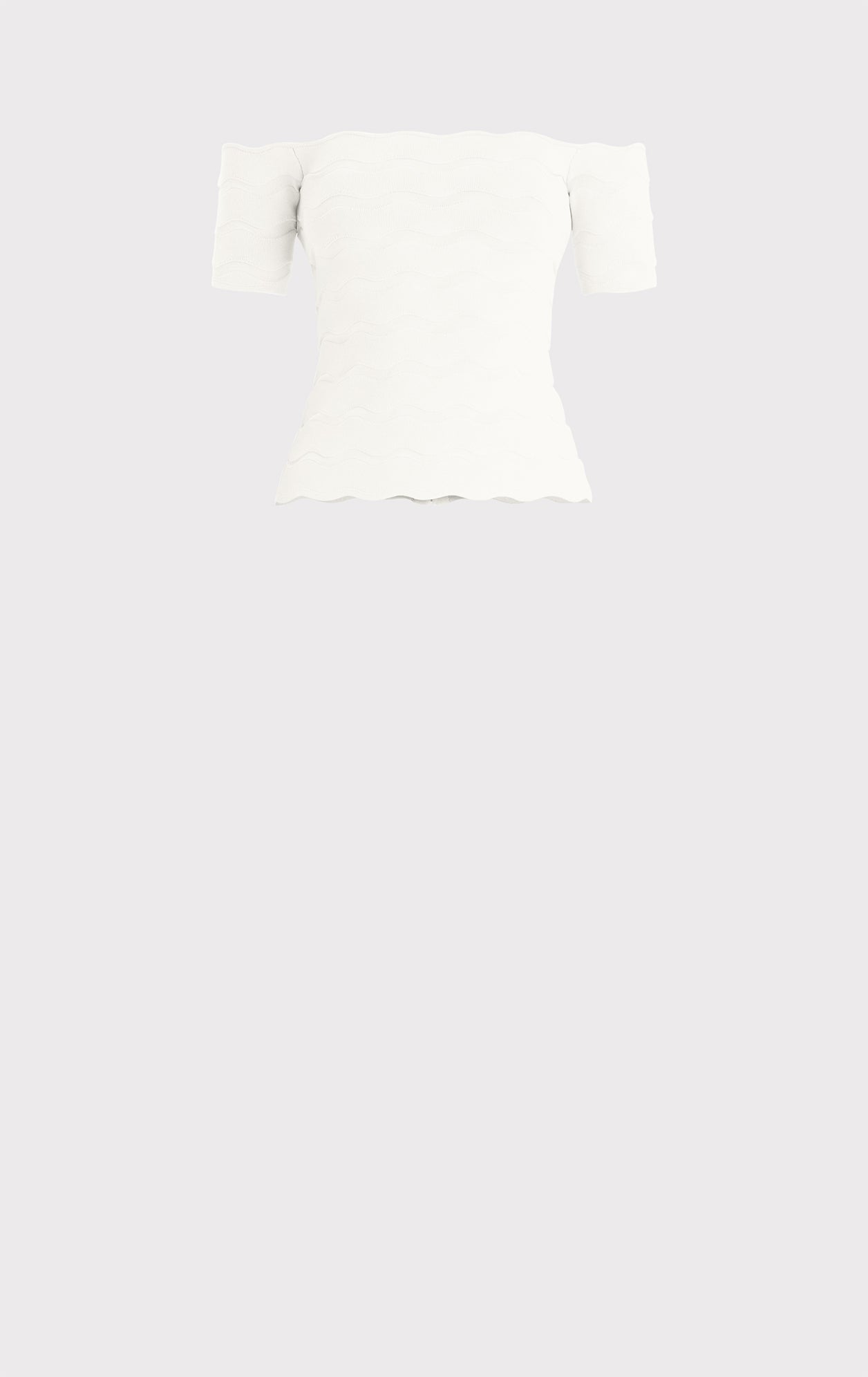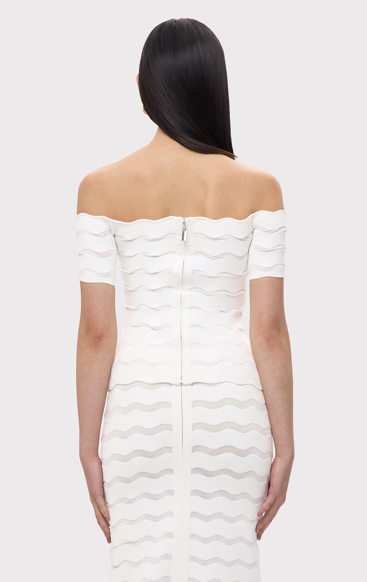 Part of our Spring ’25 collection, the body-hugging Lainey Top is a semi-sheer scalloped design with off-shoulder styling. The top hits at the hips and is finished with a center-back zip. Pair with the Eloise Skirt for a matching set.