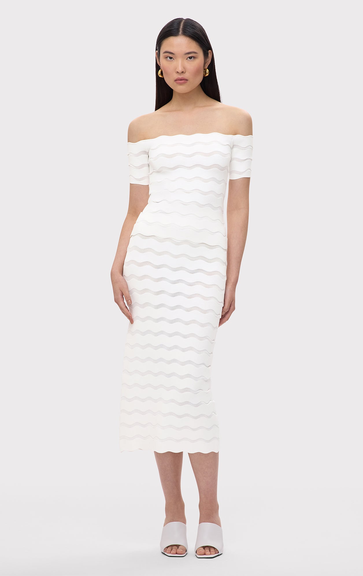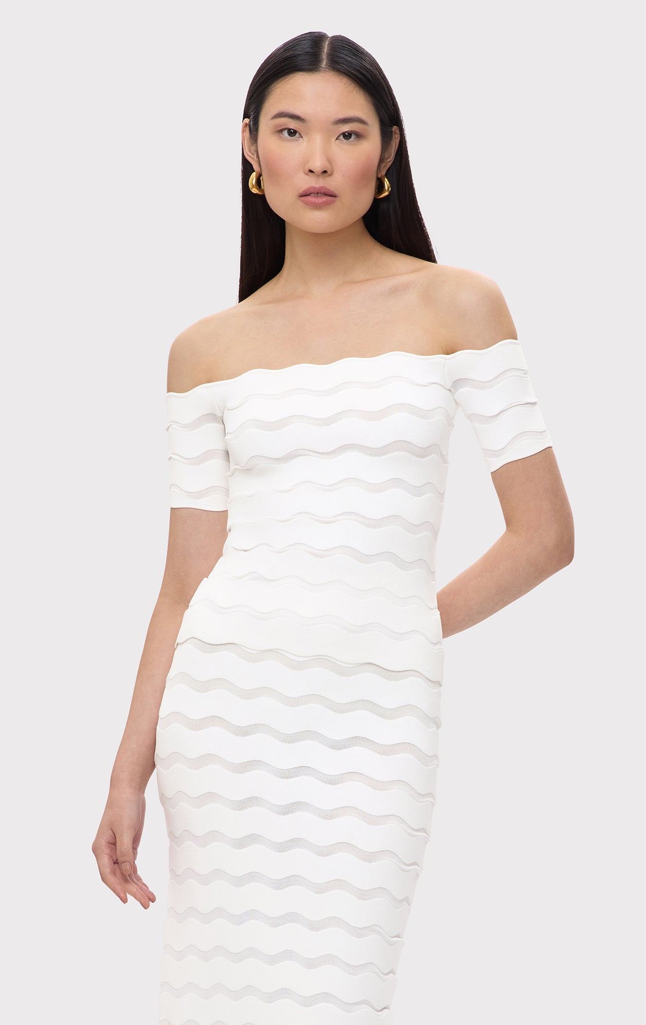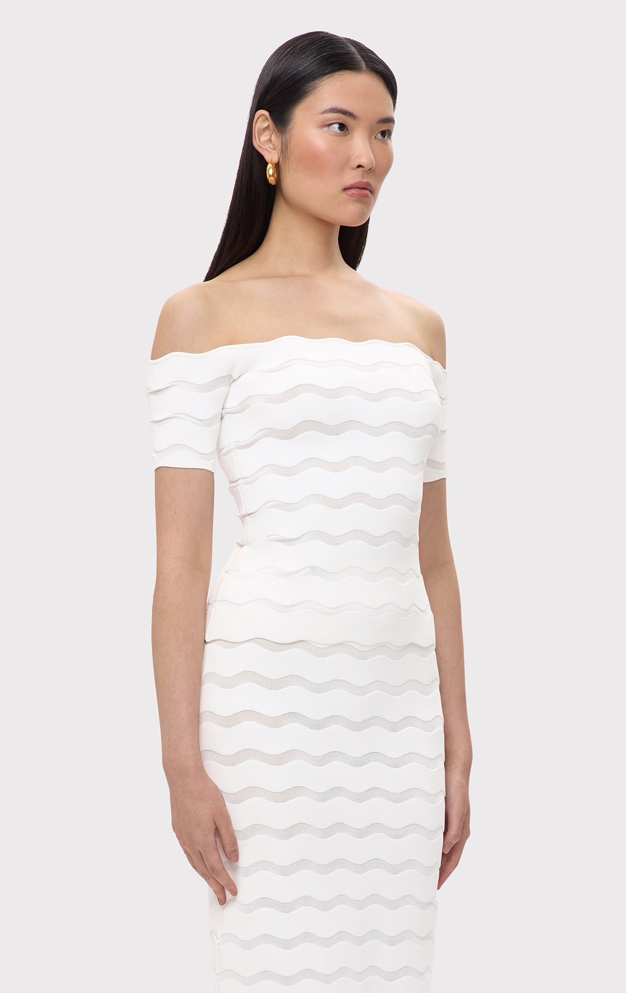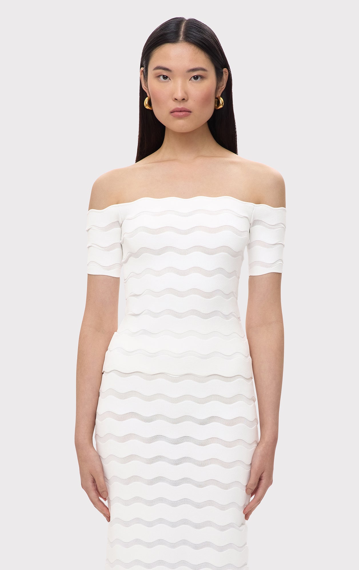 Part of our Spring ’25 collection, the body-hugging Lainey Top is a semi-sheer scalloped design with off-shoulder styling. The top hits at the hips and is finished with a center-back zip. Pair with the Eloise Skirt for a matching set.