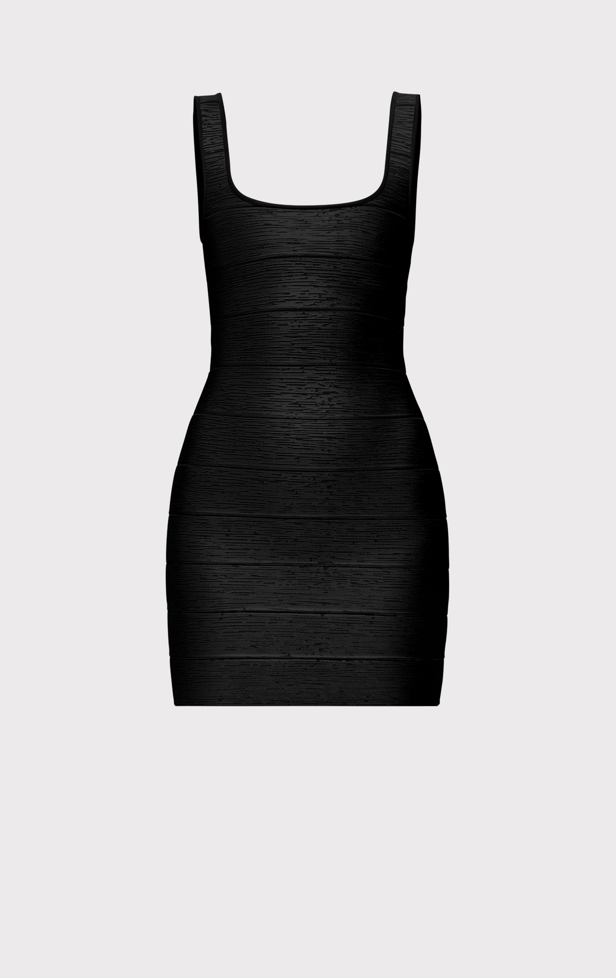 A signature bandage dress in metallic black foil designed to smooth and sculpt the body. Features a scoop neckline and a mini length. Finished with a center-back zip and made with eco-friendly recycled yarns.