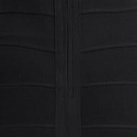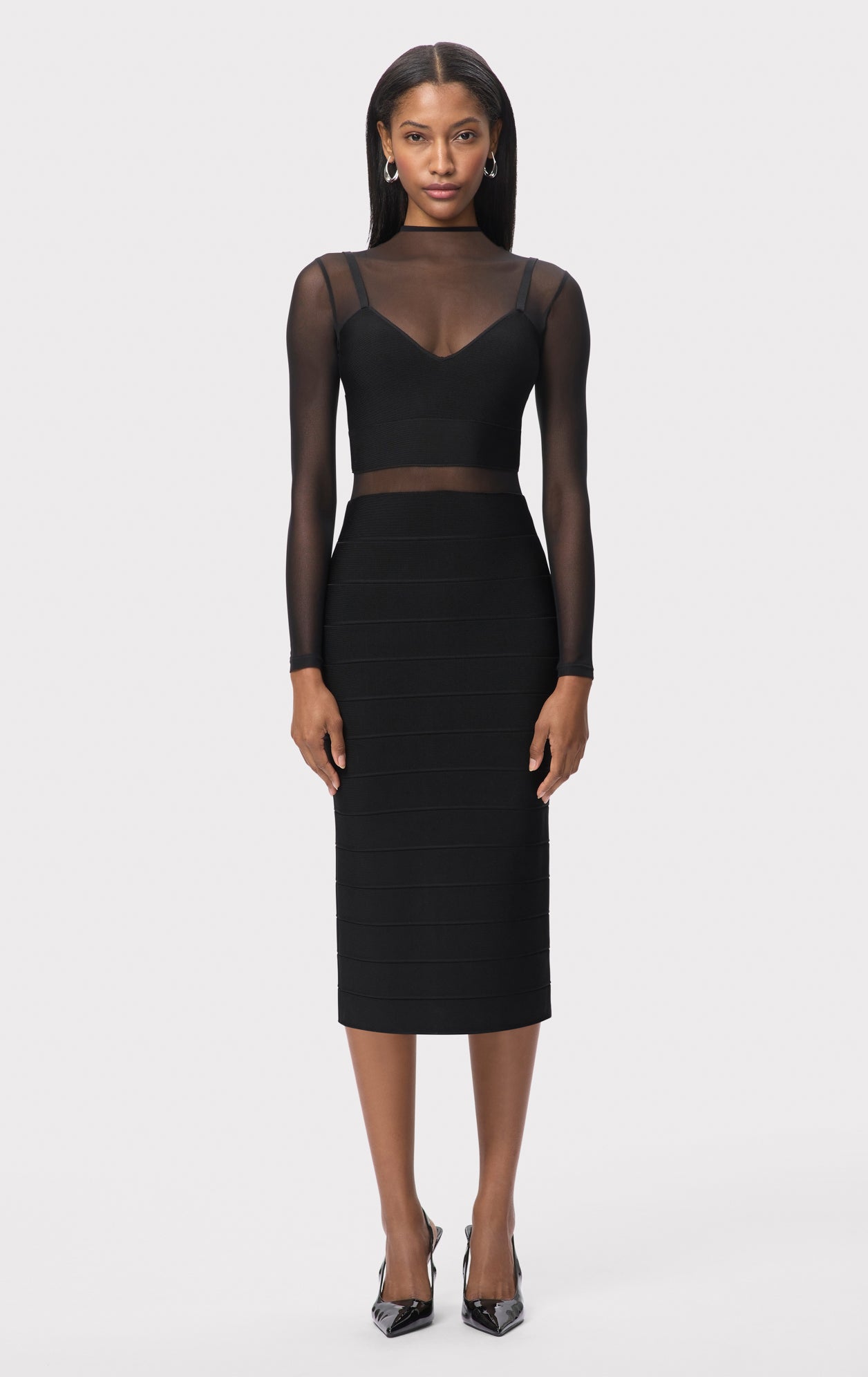 The Noelle Dress, as seen in Look 18 of the Resort '26 Lookbook, features a midi-length column silhouette in body-contouring bandage. The long-sleeve, high-neck design is detailed with stretch illusion mesh to create two-piece illusion effect and is finished with a back slit and center-back zip.