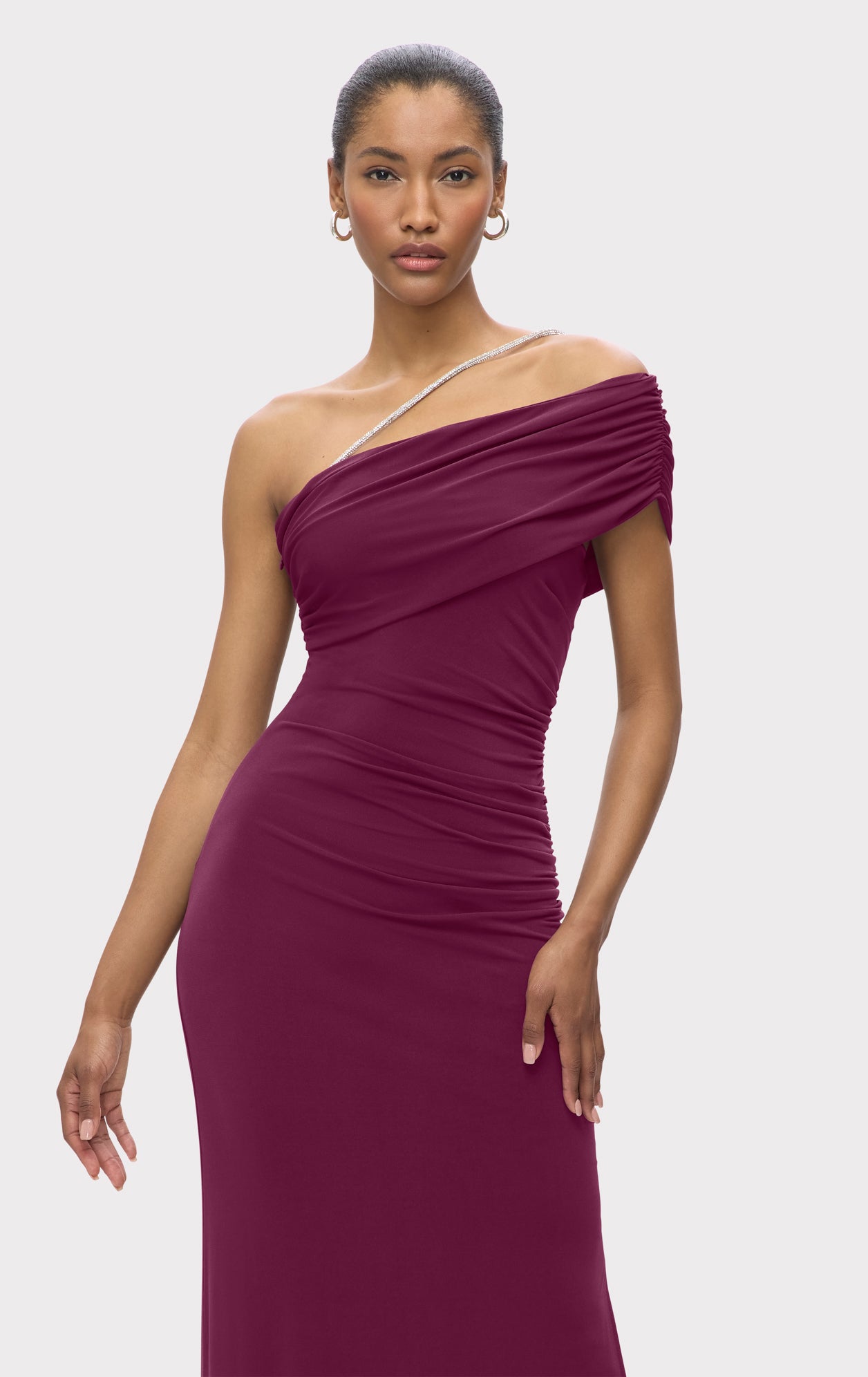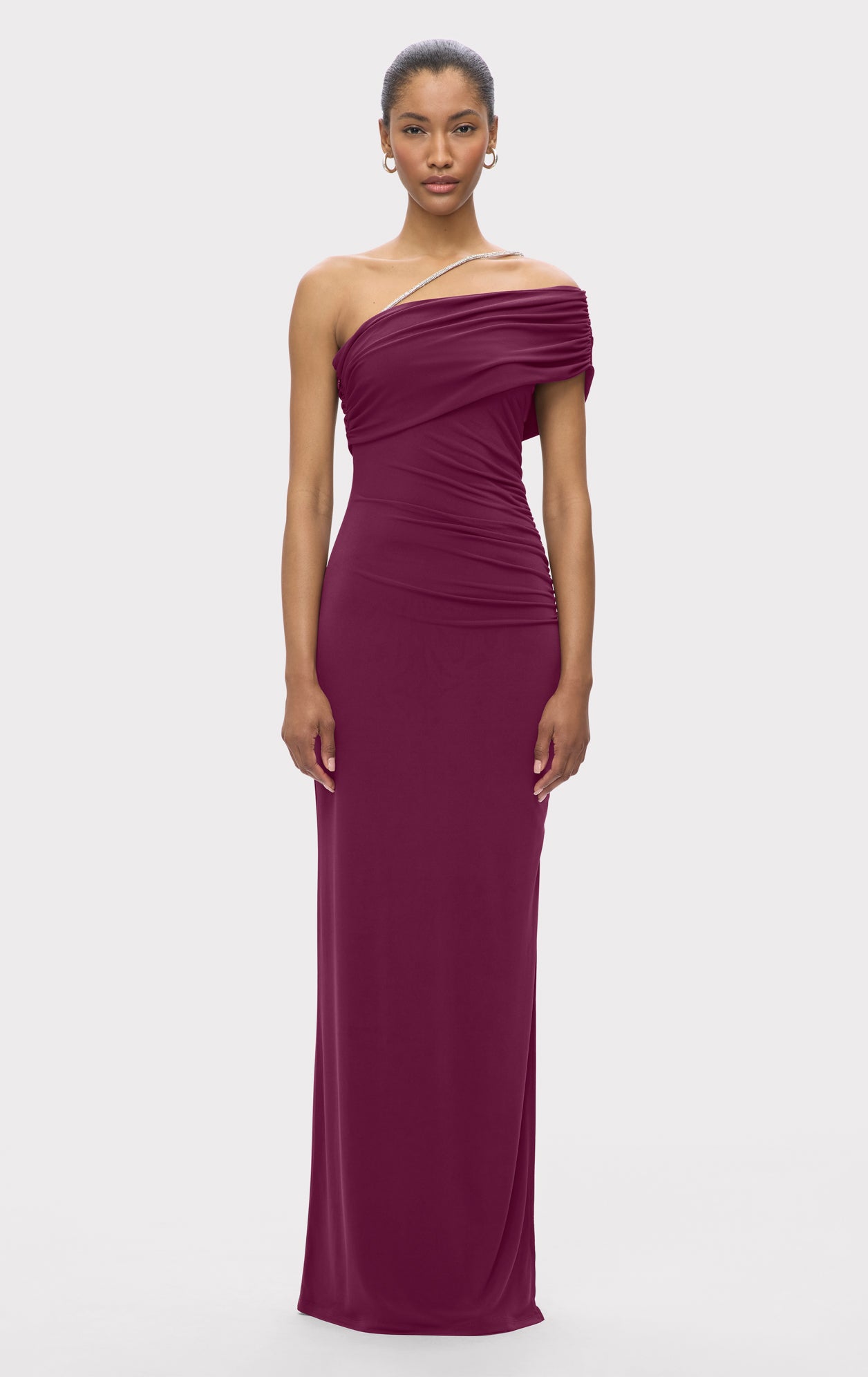 The body-skimming Olivia Gown is cut from a lightweight, draped jersey with a leg-baring side slit. It is finished with an off-shoulder, asymmetrical silhouette and crystal trim neckline detailing. As seen on Shay Mitchell at the 2023 CFDA Awards.