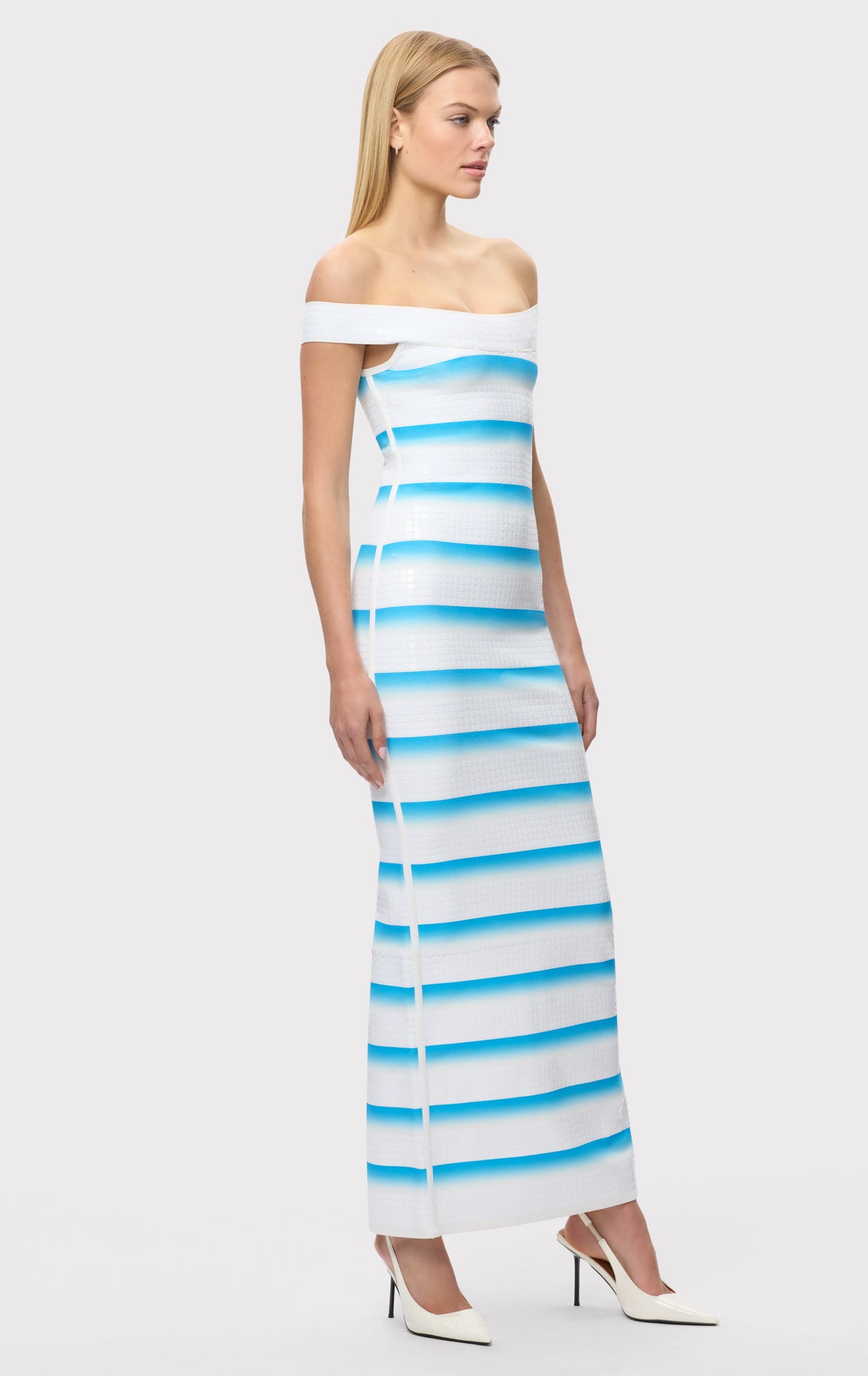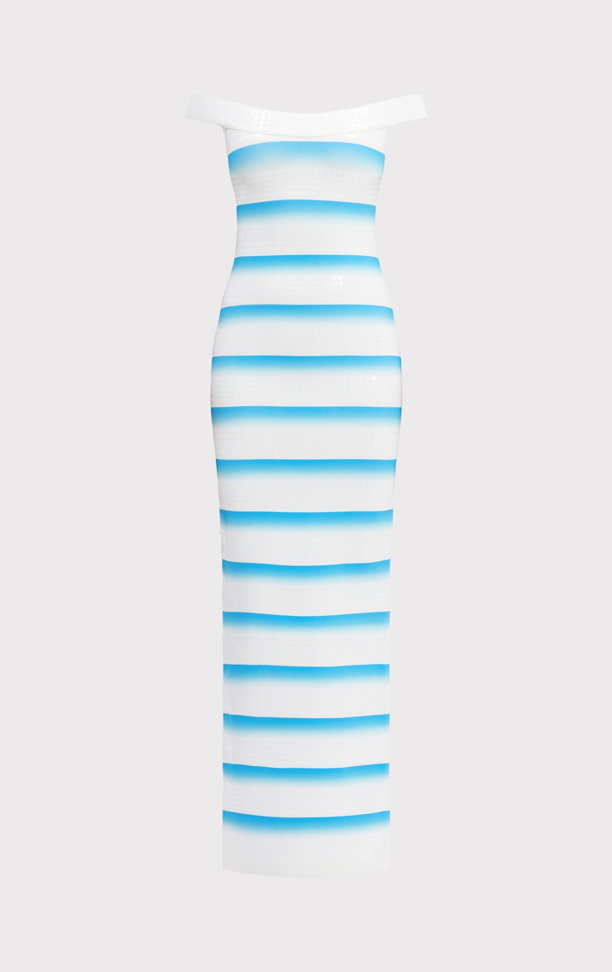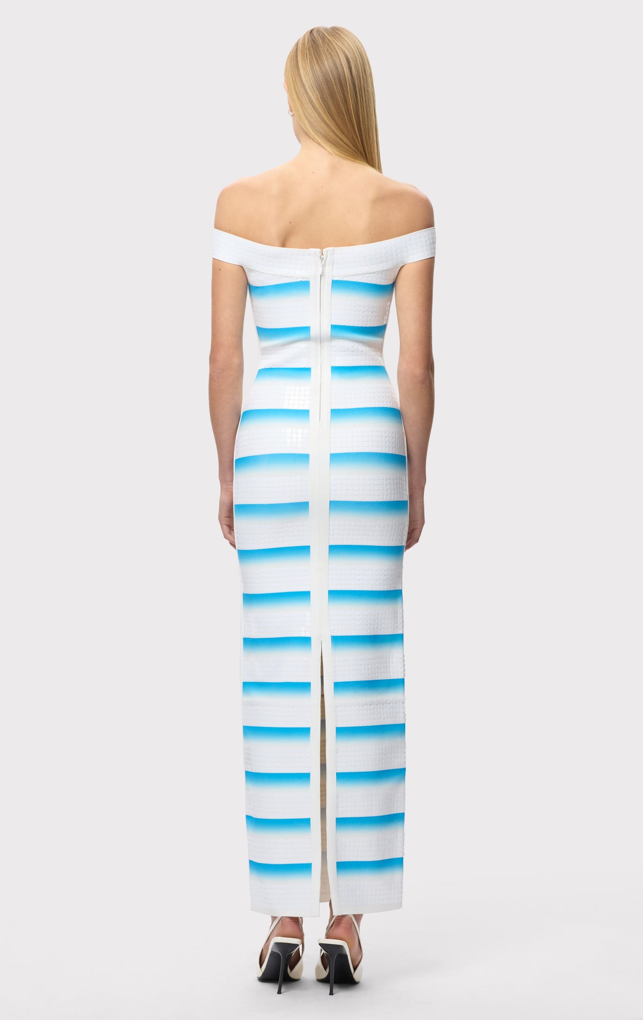 New for Spring '26, the Rina Gown is a body-hugging, ankle-length silhouette cut from a compact knit with a banded ombre effect and sequin bandage detailing. Features off-shoulder styling, a back slit and is finished with a center-back zip.